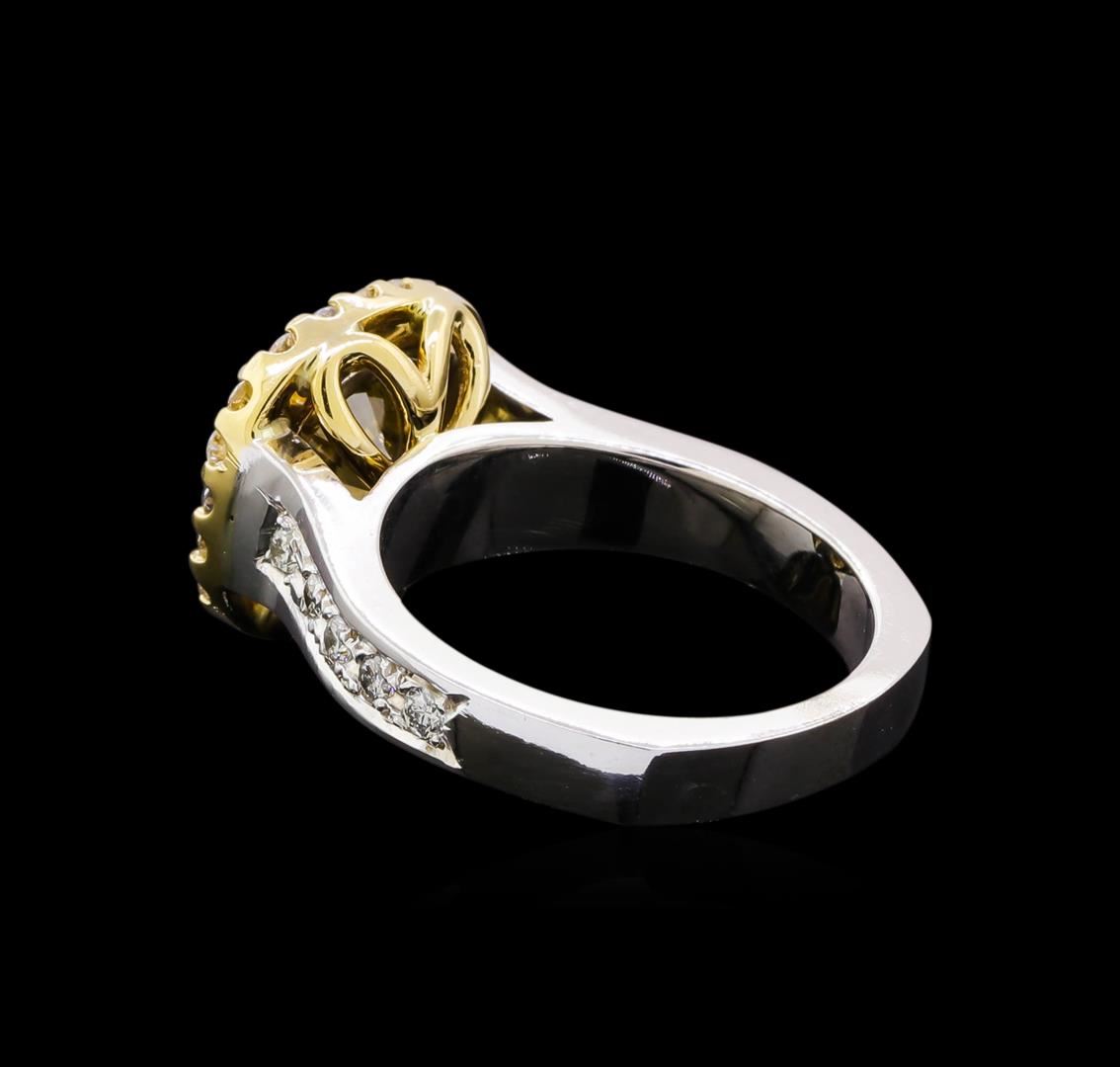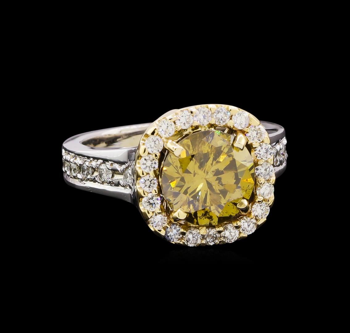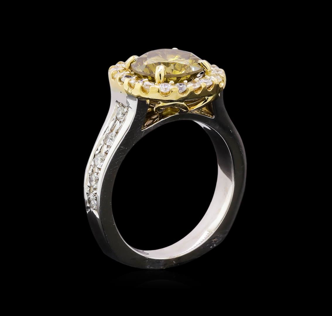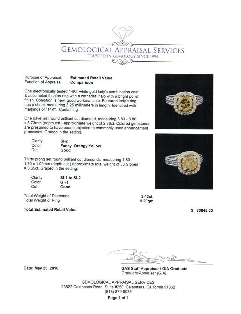 One electronically tested 14KT white gold lady's combination cast & assembled fashion ring with a cathedral halo with a bright polish finish. Featured lady's ring has a shank measuring 3.25 millimeters in width. Identified with markings of "14K". Condition is new, good workmanship. Containing: One pave' set round brilliant cut diamond, measuring 8.83 - 8.80 x 5.73mm (depth est.) approximate weight of 2.78ct. Colored gemstones are presumed to have been subjected to commonly used enhancement processes. Graded in the setting. Clarity: SI-2 Cut Good Thirty prong set round brilliant cut diamonds, measuring 1.80 - 1.70 x 1.09mm (depth est.) approximate total weight of 30 Stones = 0.65ct. Graded in the setting. Clarity: SI-1 to SI-2. Color: G - I. Cut Good. Total Weight of Diamonds 3.43ct. Total Weight of Ring 9.20gm. GAS Appraised at $33,645.00.