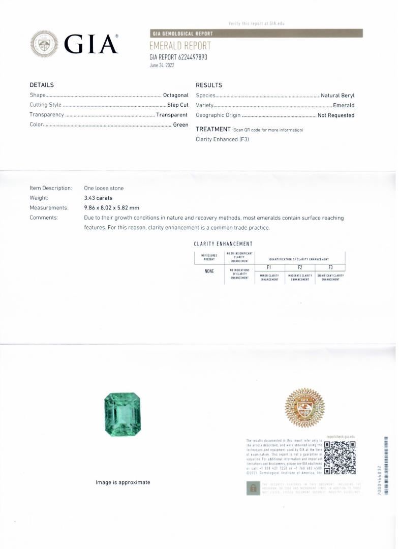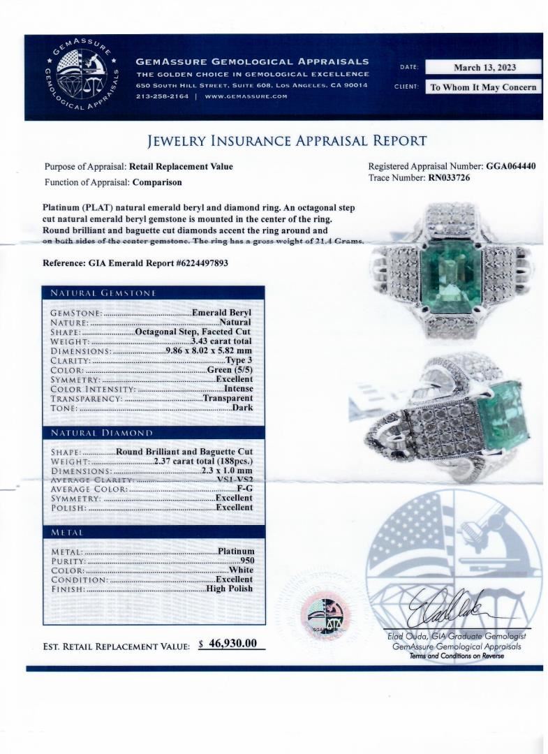 Platinum (PLAT) natural emerald beryl and diamond ring. An octagonal step cut natural emerald beryl gemstone is mounted in the center of the ring. Round brilliant and baguette cut diamonds accent the ring around and on both sides of the center gemstone. The ring has a gross weight of 21.4 Grams. Reference: GIA Emerald Report 6224497893 Brand: Oscar Friedman #NATURAL GEMSTONE# GEMSTONE: Emerald Beryl; NATURE: Natural; SHAPE: Octagonal Step, Faceted Cut; WEIGHT: 3.43 carat total; DIMENSIONS: 9.86 x 8.02 x 5.82mm; CLARITY: Type 3; COLOR: Green (5/5); SYMMETRY: Excellent; COLOR INTENSITY: Intense; TRANSPARENCY: Transparent; TONE: Dark #NATURAL DIAMOND# SHAPE: Round Brilliant and Baguette Cut; WEIGHT: 2.37 carat total (188pcs.); DIMENSIONS: 2.3 x 1.0mm; AVERAGE CLARITY: VS1-VS2; AVERAGE COLOR: F-G; SYMMETRY: Excellent; POLISH: Excellent #METAL# METAL: Platinum; PURITY: 950; COLOR: White; CONDITION: Excellent; FINISH: High Polish #Size: 7