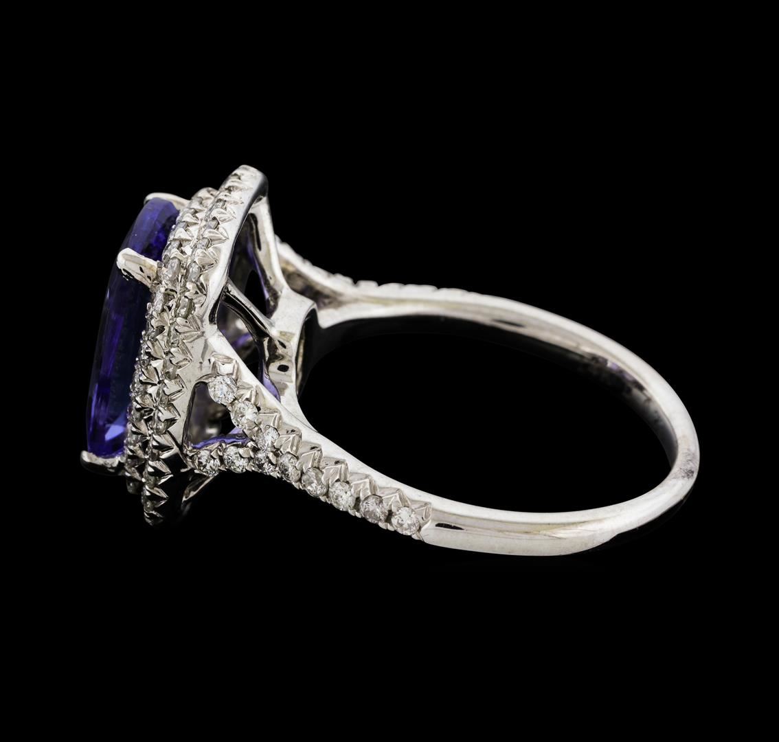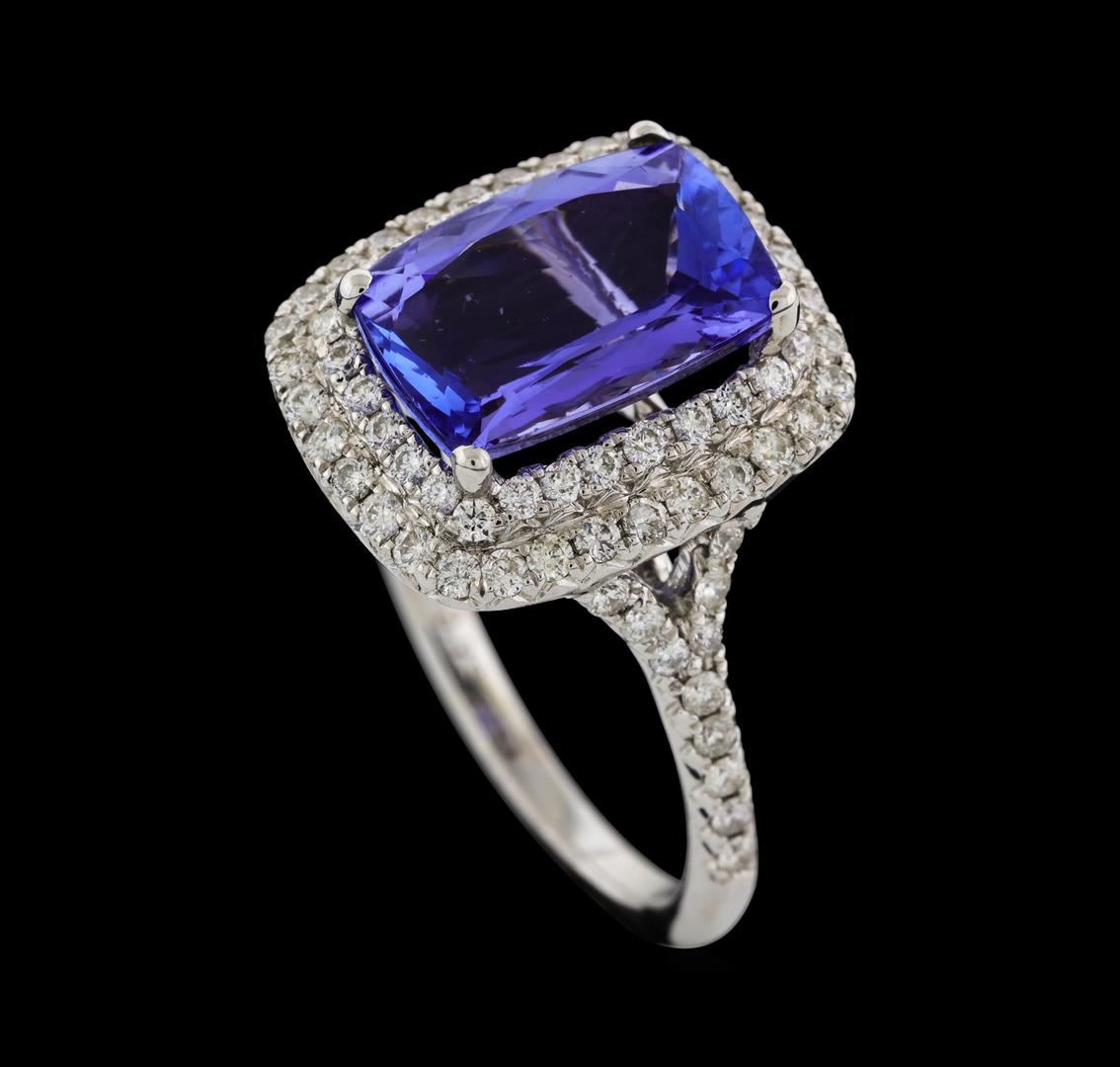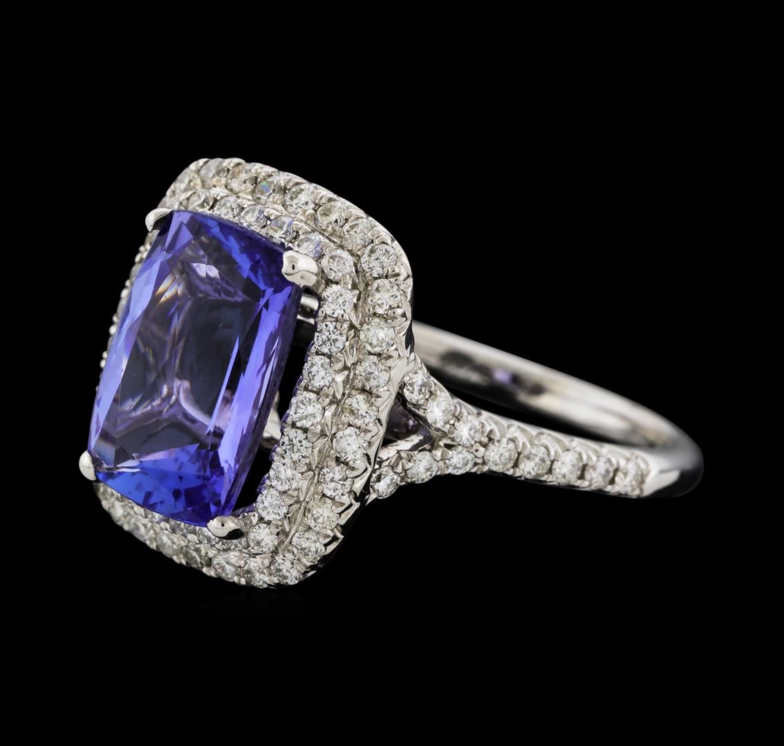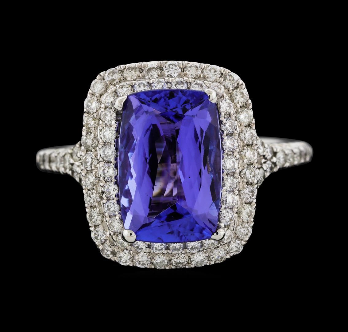 One electronically tested 14KT white gold lady's cast fashion ring with a split shank double basket halo with a bright polish finish. The featured lady's ring has a shank measuring 1.84 millimeters wide, Identified with markings of '14K'. Condition is new, good workmanship. Containing: One prong set rectangular cushion modified brilliant cut natural tanzanite, measuring 11.23 x 7.51 x 4.51mm, (depth est.) 15%. bulge factor, approximate weight of 3.43ct., clarity is eye clean, medium light, moderately strong, violetish blue color, (GIA vB 4/4), cut is good. Transmitting light with no distortion, transparent. Colored gemstones are presumed to have been subjected to commonly used enhancement processes. Graded in the setting. Eighty-Two prong set round brilliant cut diamonds, measuring 1.40 - 1.30 x 0.81mm (depth est.) approximate total weight of 82 Stones = 0.73ct. Graded in the setting. Clarity SI-1 to SI-2. Color: H - I Cut Good. Total Weight of Colored Stones 3.43ct.. Total Weight of Diamonds 0.73ct.. Total Weight of Ring 4.80gm. GAS Appraised at $6,895.00.