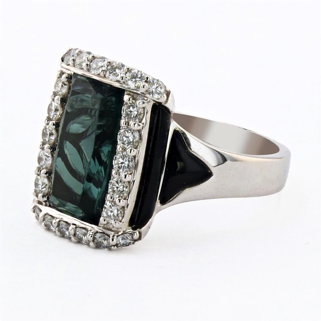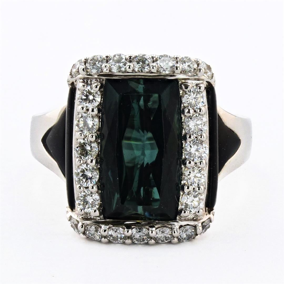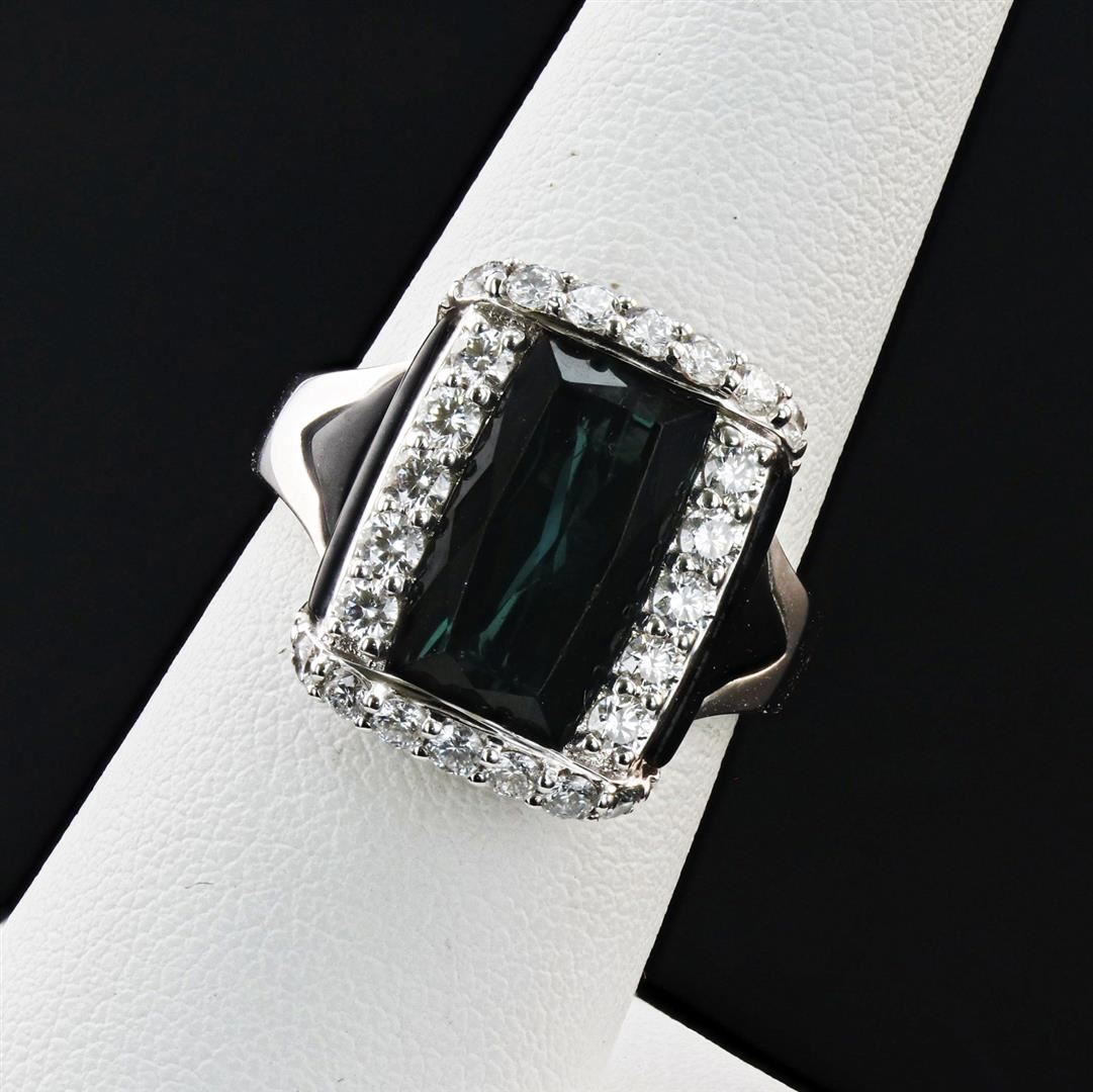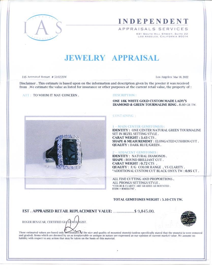 DESCRIPTION: ONE 18K WHITE GOLD CUSTOM MADE LADY'S DIAMOND and GREEN TOURMALINE RING . 8.60 GR TW #1 - MAIN CENTER GEMSTONE(S):# IDENTITY: ONE CENTER NATURAL GREEN TOURMALINE SET IN BEZEL SETTING STYLE CARAT WEIGHT: 3.43 CTS SHAPE and MEASUREMEMT: ELONGAT