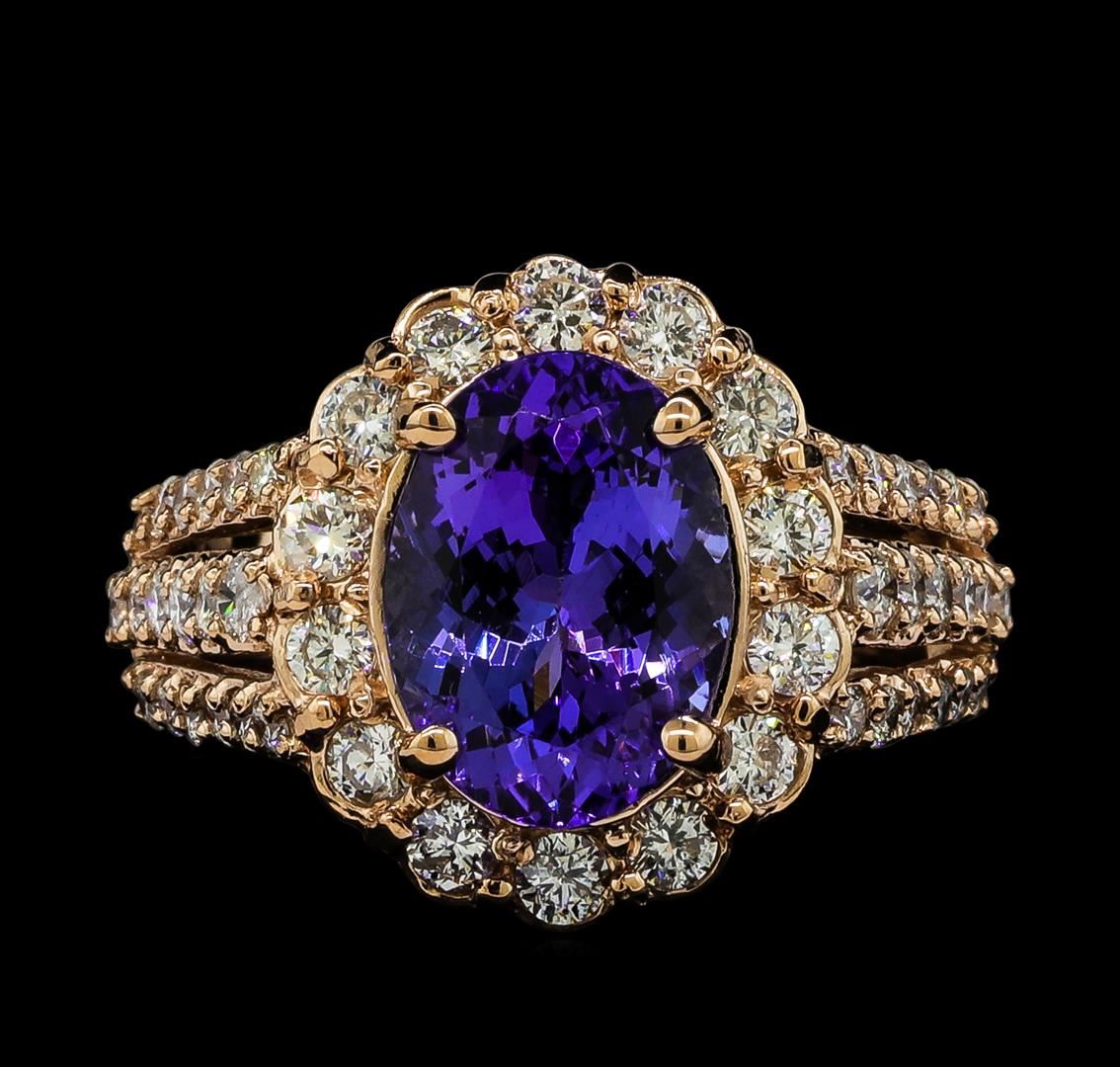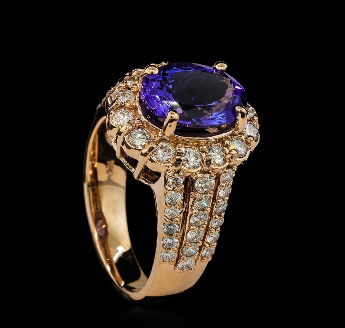 One electronically tested 14KT rose gold lady's cast fashion ring with a three row basket halo with a bright polish finish. The featured lady's ring has a shank measuring 3.66 millimeters wide. Identified with markings of 'K14'. Condition is new, good workmanship. Containing: One prong set oval modified brilliant cut natural tanzanite, measuring 11.11 x 8.13 x 5.53mm, (depth est.) approximate weight of 3.44ct., clarity is eye clean, medium dark, moderately strong, violetish blue color, (GIA vB 6/4), cut is very good. Transmitting light with no distortion, transparent. Colored gemstones are presumed to have been subjected to commonly used enhancement processes. Graded in the setting. Fourteen prong set round brilliant cut diamonds, measuring 2.25 - 2.15 x 1.36mm (depth est.) approximate total weight of 14 Stones = 0.57ct. Graded in the setting. Clarity SI-1 to SI-2. Color: H - I Cut Good Twelve prong set round brilliant cut diamonds, measuring 2.00 - 1.80 x 1.14mm (depth est.) approximate total weight of 12 Stones = 0.30ct. Graded in the setting. Clarity SI-1 to I-1. Color: H - I Cut Good Twenty-Four prong set round brilliant cut diamonds, measuring 1.55 - 1.45 x 0.93mm (depth est.) approximate total weight of 24 Stones = 0.32ct. Graded in the setting. Clarity SI-1 to I-1. Color: H - I Cut Good. Total Weight of Colored Stones 3.44ct.. Total Weight of Diamonds 1.19ct.. Total Weight of Ring 8.30gm. GAS Appraised at $10,155.00.
