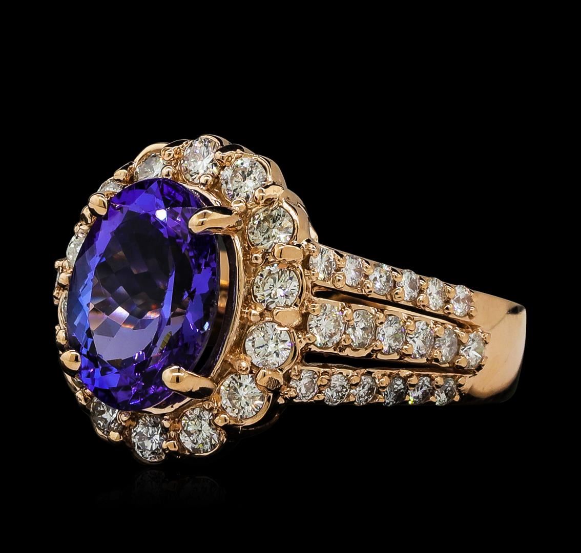 One electronically tested 14KT rose gold lady's cast fashion ring with a three row basket halo with a bright polish finish. The featured lady's ring has a shank measuring 3.66 millimeters wide. Identified with markings of 'K14'. Condition is new, good workmanship. Containing: One prong set oval modified brilliant cut natural tanzanite, measuring 11.11 x 8.13 x 5.53mm, (depth est.) approximate weight of 3.44ct., clarity is eye clean, medium dark, moderately strong, violetish blue color, (GIA vB 6/4), cut is very good. Transmitting light with no distortion, transparent. Colored gemstones are presumed to have been subjected to commonly used enhancement processes. Graded in the setting. Fourteen prong set round brilliant cut diamonds, measuring 2.25 - 2.15 x 1.36mm (depth est.) approximate total weight of 14 Stones = 0.57ct. Graded in the setting. Clarity SI-1 to SI-2. Color: H - I Cut Good Twelve prong set round brilliant cut diamonds, measuring 2.00 - 1.80 x 1.14mm (depth est.) approximate total weight of 12 Stones = 0.30ct. Graded in the setting. Clarity SI-1 to I-1. Color: H - I Cut Good Twenty-Four prong set round brilliant cut diamonds, measuring 1.55 - 1.45 x 0.93mm (depth est.) approximate total weight of 24 Stones = 0.32ct. Graded in the setting. Clarity SI-1 to I-1. Color: H - I Cut Good. Total Weight of Colored Stones 3.44ct.. Total Weight of Diamonds 1.19ct.. Total Weight of Ring 8.30gm. GAS Appraised at $10,155.00.