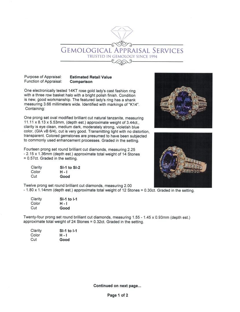 One electronically tested 14KT rose gold lady's cast fashion ring with a three row basket halo with a bright polish finish. The featured lady's ring has a shank measuring 3.66 millimeters wide. Identified with markings of 'K14'. Condition is new, good workmanship. Containing: One prong set oval modified brilliant cut natural tanzanite, measuring 11.11 x 8.13 x 5.53mm, (depth est.) approximate weight of 3.44ct., clarity is eye clean, medium dark, moderately strong, violetish blue color, (GIA vB 6/4), cut is very good. Transmitting light with no distortion, transparent. Colored gemstones are presumed to have been subjected to commonly used enhancement processes. Graded in the setting. Fourteen prong set round brilliant cut diamonds, measuring 2.25 - 2.15 x 1.36mm (depth est.) approximate total weight of 14 Stones = 0.57ct. Graded in the setting. Clarity SI-1 to SI-2. Color: H - I Cut Good Twelve prong set round brilliant cut diamonds, measuring 2.00 - 1.80 x 1.14mm (depth est.) approximate total weight of 12 Stones = 0.30ct. Graded in the setting. Clarity SI-1 to I-1. Color: H - I Cut Good Twenty-Four prong set round brilliant cut diamonds, measuring 1.55 - 1.45 x 0.93mm (depth est.) approximate total weight of 24 Stones = 0.32ct. Graded in the setting. Clarity SI-1 to I-1. Color: H - I Cut Good. Total Weight of Colored Stones 3.44ct.. Total Weight of Diamonds 1.19ct.. Total Weight of Ring 8.30gm. GAS Appraised at $10,155.00.