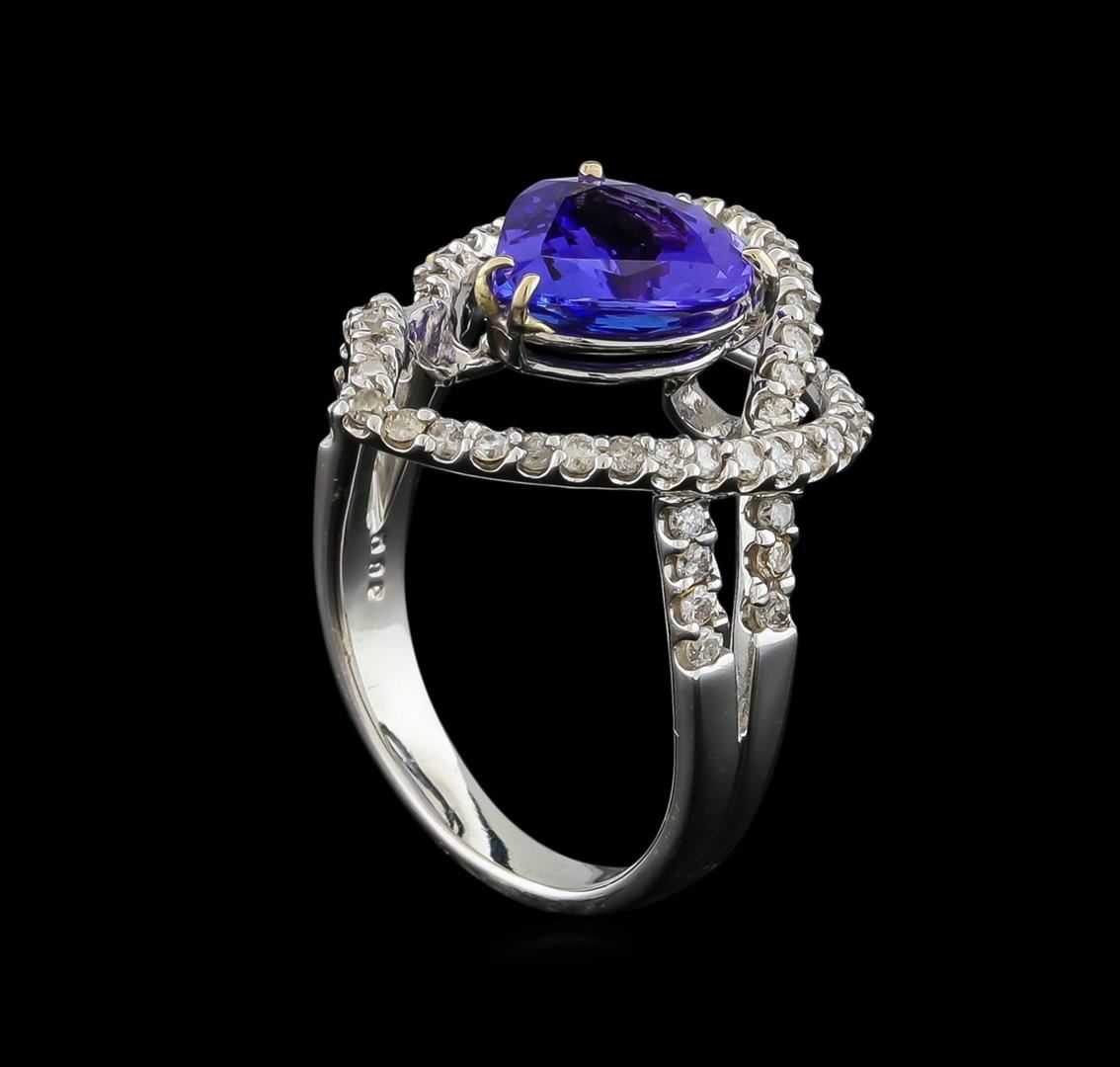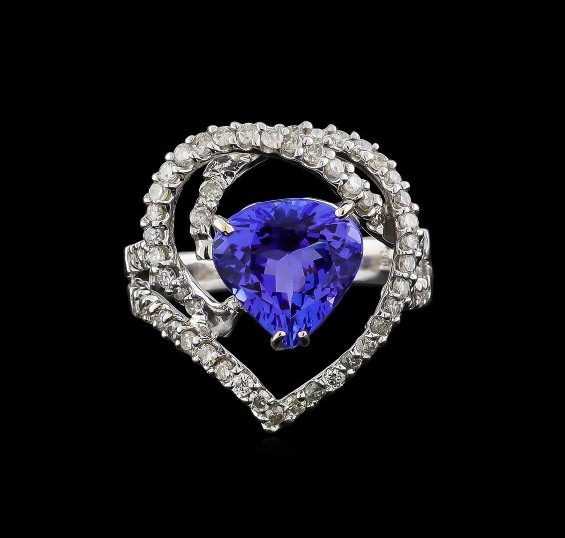 One electronically tested 18KT white gold ladies cast tanzanite and diamond ring with a bright polish finish. The featured tanzanite is set within intertwining diamond ribbons forming a stylized heart design supported by diamond set split shoulders, completed by a grooved two and one-half millimeter wide band. Identified with markings of "18K". Condition is new, good workmanship. Containing: One prong set pear mixed cut natural tanzanite, measuring 9.85 x 9.82 x 5.15mm, approximate weight of 3.44ct., clarity is eye clean, type I, medium dark, very slightly grayish, violetish blue color, (GIA vB 6/3), cut is good. Transmitting light with no distortion, transparent. Graded in the setting. Tanzanite is a very rare gemstone that is only found in the country of Tanzania. Originally discovered in 1967. Tiffany & Company, named the stone Tanzanite. It is found in the Usumburu Mountains that border the Umba Valley of northern Tanzania. Tanzanite occurs in gray, brown, violet, blue, reddish-purple, & green. The gem is interesting because of its exceptional pleochroism. Rotated in different directions a tanzanite will exhibit multiple changes of color. Tanzanite has a low tolerance to ultrasonic cleaning, and should not be cleaned using this method. Sixty-Three prong set round brilliant cut diamonds, measuring 1.60 - 1.50 x 0.93mm (depth est.) approximate total weight of 63 Stones = 0.88ct. Graded in the setting. Clarity: I-2 to I-3. Color: H - J. Total Weight of Colored Stones 3.44ct. Total Weight of Diamonds 0.88ct. Total Weight of Ring 6.76gm. AIG Appraised at $10,580.00.