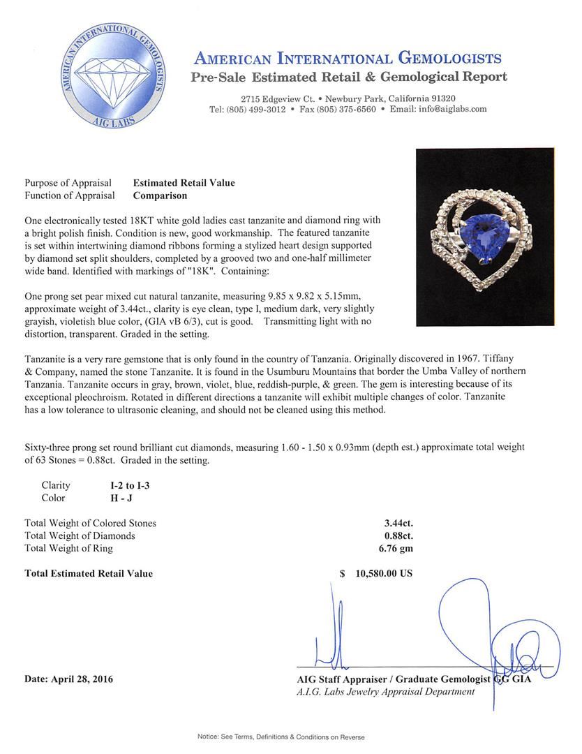 One electronically tested 18KT white gold ladies cast tanzanite and diamond ring with a bright polish finish. The featured tanzanite is set within intertwining diamond ribbons forming a stylized heart design supported by diamond set split shoulders, completed by a grooved two and one-half millimeter wide band. Identified with markings of "18K". Condition is new, good workmanship. Containing: One prong set pear mixed cut natural tanzanite, measuring 9.85 x 9.82 x 5.15mm, approximate weight of 3.44ct., clarity is eye clean, type I, medium dark, very slightly grayish, violetish blue color, (GIA vB 6/3), cut is good. Transmitting light with no distortion, transparent. Graded in the setting. Tanzanite is a very rare gemstone that is only found in the country of Tanzania. Originally discovered in 1967. Tiffany & Company, named the stone Tanzanite. It is found in the Usumburu Mountains that border the Umba Valley of northern Tanzania. Tanzanite occurs in gray, brown, violet, blue, reddish-purple, & green. The gem is interesting because of its exceptional pleochroism. Rotated in different directions a tanzanite will exhibit multiple changes of color. Tanzanite has a low tolerance to ultrasonic cleaning, and should not be cleaned using this method. Sixty-Three prong set round brilliant cut diamonds, measuring 1.60 - 1.50 x 0.93mm (depth est.) approximate total weight of 63 Stones = 0.88ct. Graded in the setting. Clarity: I-2 to I-3. Color: H - J. Total Weight of Colored Stones 3.44ct. Total Weight of Diamonds 0.88ct. Total Weight of Ring 6.76gm. AIG Appraised at $10,580.00.