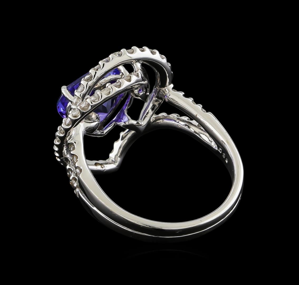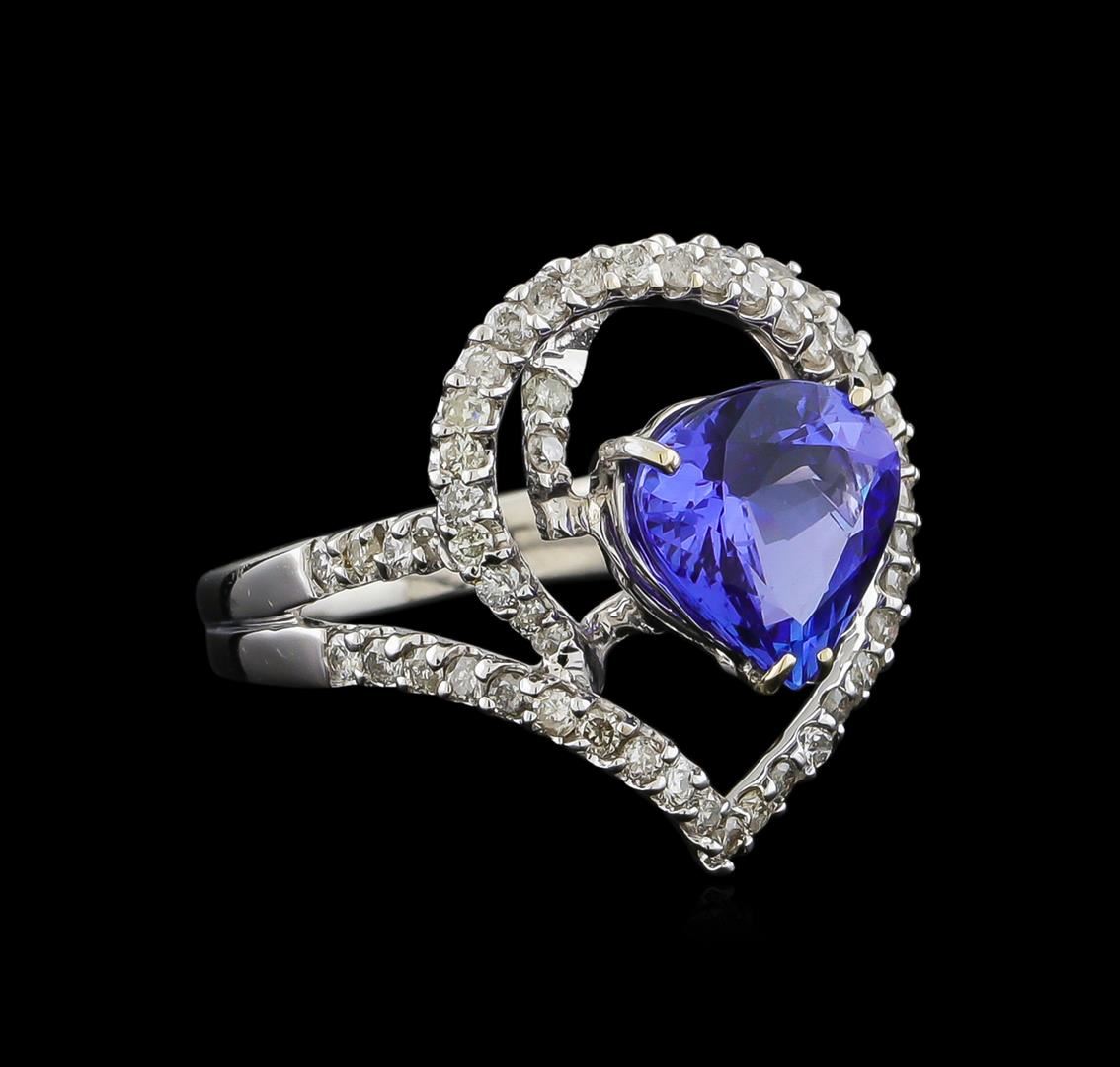 One electronically tested 18KT white gold ladies cast tanzanite and diamond ring with a bright polish finish. The featured tanzanite is set within intertwining diamond ribbons forming a stylized heart design supported by diamond set split shoulders, completed by a grooved two and one-half millimeter wide band. Identified with markings of "18K". Condition is new, good workmanship. Containing: One prong set pear mixed cut natural tanzanite, measuring 9.85 x 9.82 x 5.15mm, approximate weight of 3.44ct., clarity is eye clean, type I, medium dark, very slightly grayish, violetish blue color, (GIA vB 6/3), cut is good. Transmitting light with no distortion, transparent. Graded in the setting. Tanzanite is a very rare gemstone that is only found in the country of Tanzania. Originally discovered in 1967. Tiffany & Company, named the stone Tanzanite. It is found in the Usumburu Mountains that border the Umba Valley of northern Tanzania. Tanzanite occurs in gray, brown, violet, blue, reddish-purple, & green. The gem is interesting because of its exceptional pleochroism. Rotated in different directions a tanzanite will exhibit multiple changes of color. Tanzanite has a low tolerance to ultrasonic cleaning, and should not be cleaned using this method. Sixty-Three prong set round brilliant cut diamonds, measuring 1.60 - 1.50 x 0.93mm (depth est.) approximate total weight of 63 Stones = 0.88ct. Graded in the setting. Clarity: I-2 to I-3. Color: H - J. Total Weight of Colored Stones 3.44ct. Total Weight of Diamonds 0.88ct. Total Weight of Ring 6.76gm. AIG Appraised at $10,580.00.