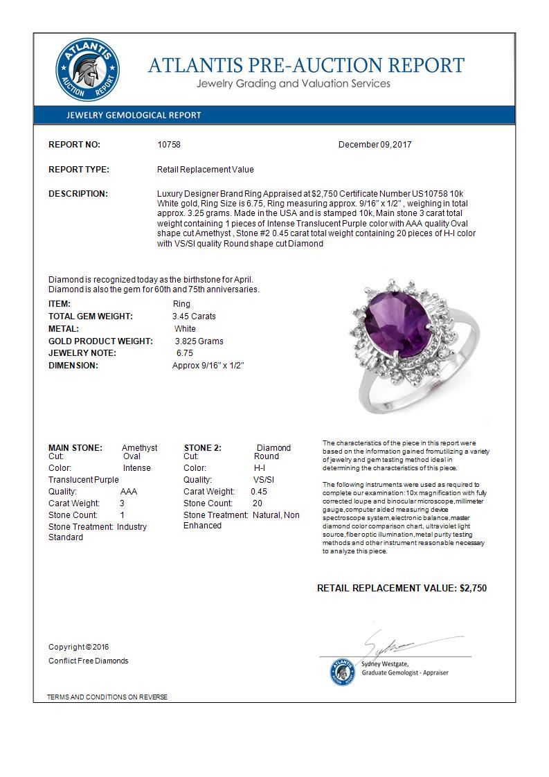 10758 - REF-41H5M ---- 3.45 CTW Amethyst & Diamond Ring 10K White Gold ---- Luxury Designer Brand Ring Appraised at $2,750 Certificate Number US10758  10k White gold,  Ring Size is 6.75, Ring measuring approx. 9/16" x  1/2" , weighing in total approx. 3.25 grams. Made in the USA and is stamped 10k, Main stone 3 carat total weight containing 1 pieces of Intense Translucent Purple color with AAA quality Oval shape cut Amethyst , Stone #2 0.45 carat total weight containing 20 pieces of H-I color with  VS/SI quality Round shape cut Diamond