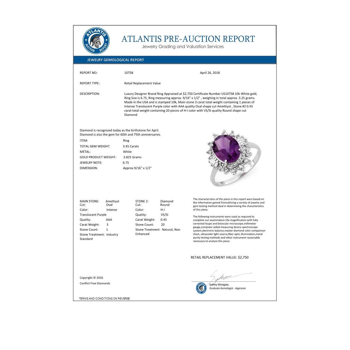 REF-41M5H -10758 ---- 3.45 CTW Amethyst & Diamond Ring 10K White Gold ---- Luxury Designer Brand Ring Appraised at $2,750 Certificate Number US10758 10k White gold, Ring Size is 6.75, Ring measuring approx. 9/16" x 1/2" , weighing in total approx. 3.25 grams. Made in the USA and is stamped 10k, Main stone 3 carat total weight containing 1 pieces of Intense Translucent Purple color with AAA quality Oval shape cut Amethyst , Stone #2 0.45 carat total weight containing 20 pieces of H-I color with VS/SI quality Round shape cut Diamond