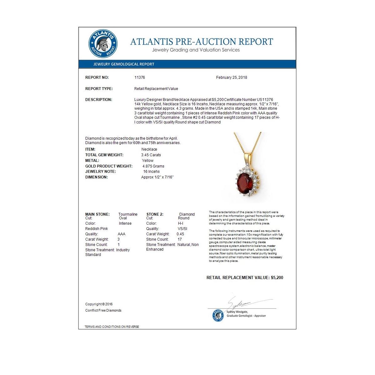 REF-67Y3K -11376 ---- 3.45 CTW Pink Tourmaline & Diamond Necklace 14K Yellow Gold ---- Luxury Designer Brand Necklace Appraised at $5,200 Certificate Number US11376 14k Yellow gold, Necklace Size is 16 Incehs, Necklace measuring approx. 1/2" x 7/16", weighing in total approx. 4.3 grams. Made in the USA and is stamped 14k, Main stone 3 carat total weight containing 1 pieces of Intense Reddish Pink color with AAA quality Oval shape cut Tourmaline , Stone #2 0.45 carat total weight containing 17 pieces of H-I color with VS/SI quality Round shape cut Diamond