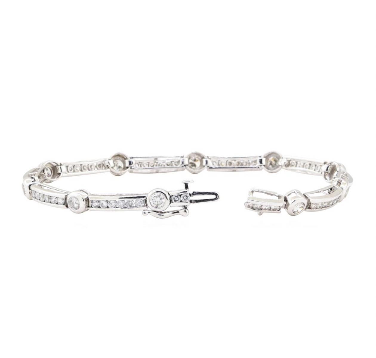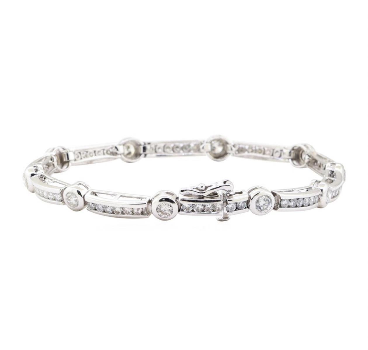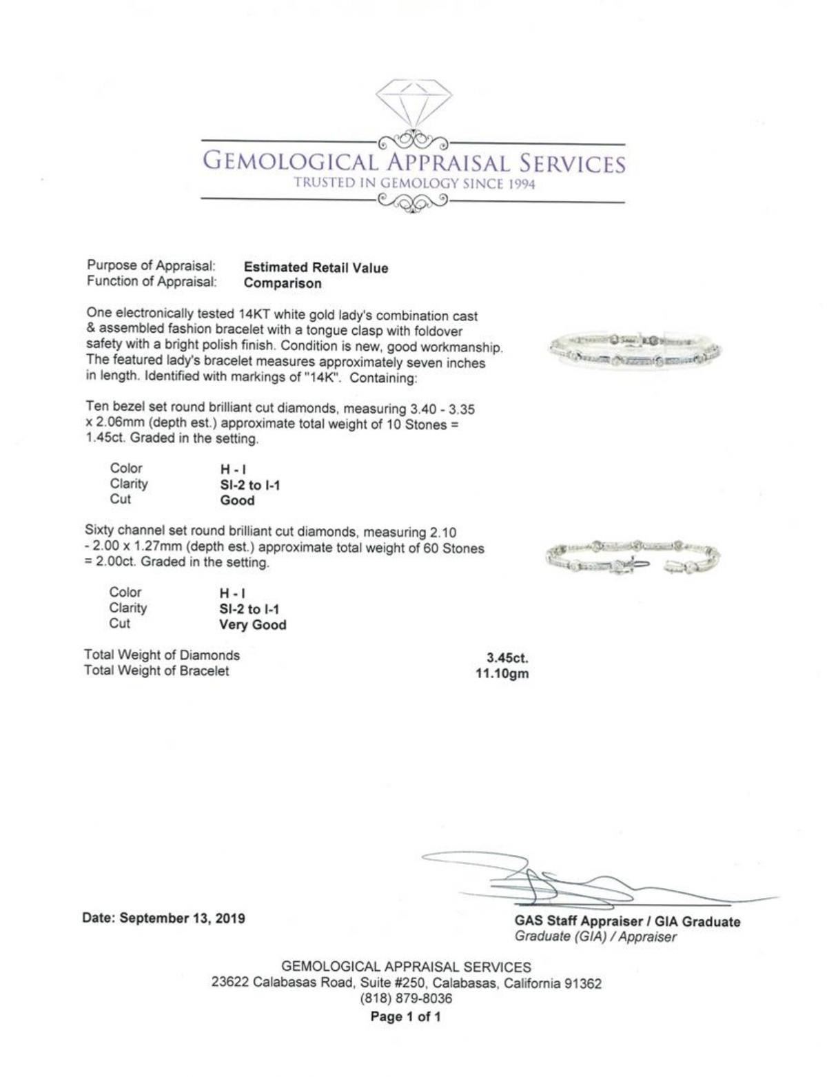 One electronically tested 14KT white gold lady's combination cast & assembled fashion bracelet with a tongue clasp with foldover safety with a bright polish finish. The featured lady's bracelet measures approximately seven inches in length. Identified with markings of '14K'. Condition is new, good workmanship. Containing: Ten bezel set round brilliant cut diamonds, measuring 3.40 - 3.35 x 2.06mm (depth est.) approximate total weight of 10 Stones = 1.45ct. Graded in the setting. Color H - I Clarity SI-2 to I-1 Cut Good Sixty channel set round brilliant cut diamonds, measuring 2.10 - 2.00 x 1.27mm (depth est.) approximate total weight of 60 Stones = 2.00ct. Graded in the setting. Color H - I Clarity SI-2 to I-1 Cut Very Good. Total Weight of Diamonds 3.45ct.. Total Weight of Bracelet 11.10gm GAS Appraised at $9050.00. GAS Appraised.