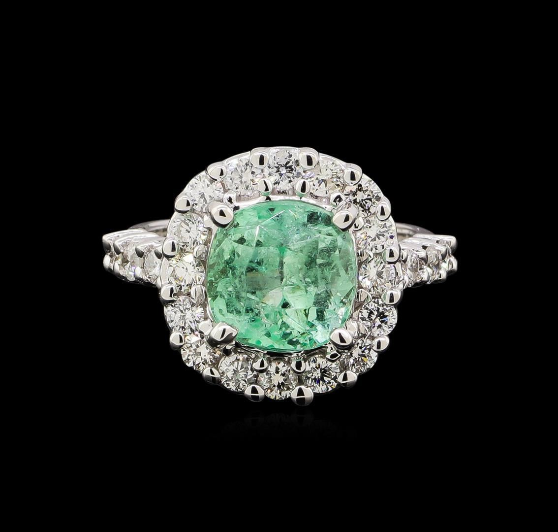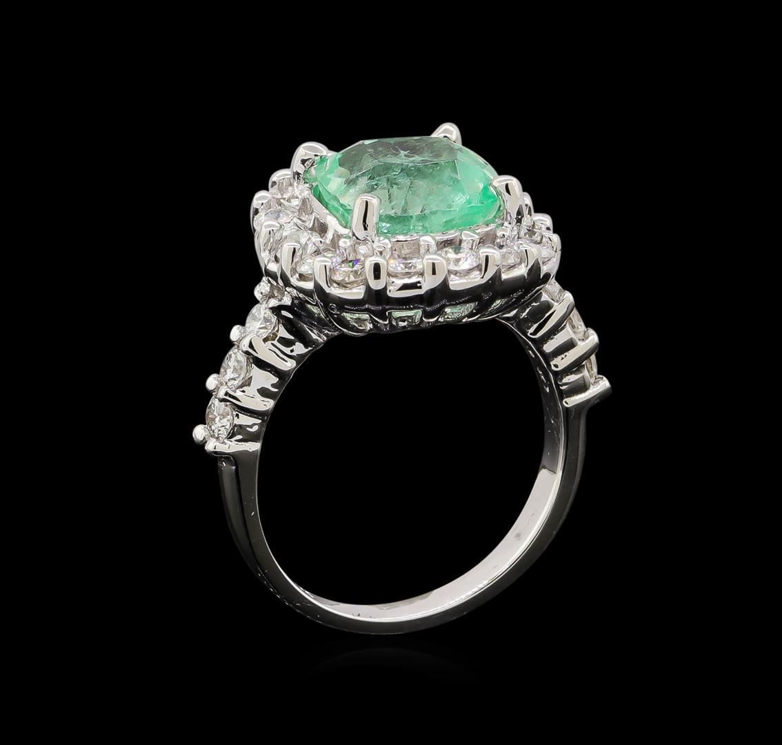 One electronically tested 14KT white gold lady's cast fashion ring with a basket halo with a bright polish finish. The featured lady's ring has a shank measuring 2.16 millimeters wide. Identified with markings of '14K'. Condition is new, good workmanship. Containing: One prong set square cushion modified brilliant cut natural emerald, measuring 9.10 x 9.06 x 6.88mm, (depth est.) approximate weight of 3.45ct., clarity is moderately included, medium light, moderately strong, green color, (GIA G 4/4), cut is good. Transmitting light with no distortion, transparent. Naturally occurring internal & external characteristics are present. Indications of oil residue. Colored gemstones are presumed to have been subjected to commonly used enhancement processes. Graded in the setting. Twenty-Two prong set round brilliant cut diamonds, measuring 2.40 - 2.30 x 1.46mm (depth est.) approximate total weight of 22 Stones = 1.10ct. Graded in the setting. Clarity SI-1 to I-1. Color: H - I Cut Good. Total Weight of Colored Stones 3.45ct.. Total Weight of Diamonds 1.10ct.. Total Weight of Ring 6.70gm. GAS Appraised.