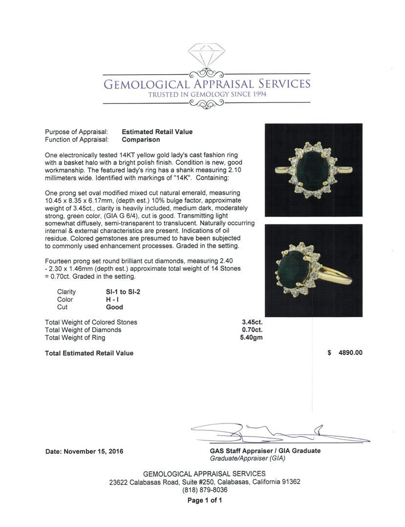 One electronically tested 14KT yellow gold lady's cast fashion ring with a basket halo with a bright polish finish. The featured lady's ring has a shank measuring 2.10 millimeters wide. Identified with markings of '14K'. Condition is new, good workmanship. Containing: One prong set oval modified mixed cut natural emerald, measuring 10.45 x 8.35 x 6.17mm, (depth est.) 10%. bulge factor, approximate weight of 3.45ct., clarity is heavily included, medium dark, moderately strong, green color, (GIA G 6/4), cut is good. Transmitting light somewhat diffusely, semi-transparent to translucent. Naturally occurring internal & external characteristics are present. Indications of oil residue. Colored gemstones are presumed to have been subjected to commonly used enhancement processes. Graded in the setting. Fourteen prong set round brilliant cut diamonds, measuring 2.40 - 2.30 x 1.46mm (depth est.) approximate total weight of 14 Stones = 0.70ct. Graded in the setting. Clarity SI-1 to SI-2. Color: H - I Cut Good. Total Weight of Colored Stones 3.45ct.. Total Weight of Diamonds 0.70ct.. Total Weight of Ring 5.40gm GAS Appraised at $4,890.00.