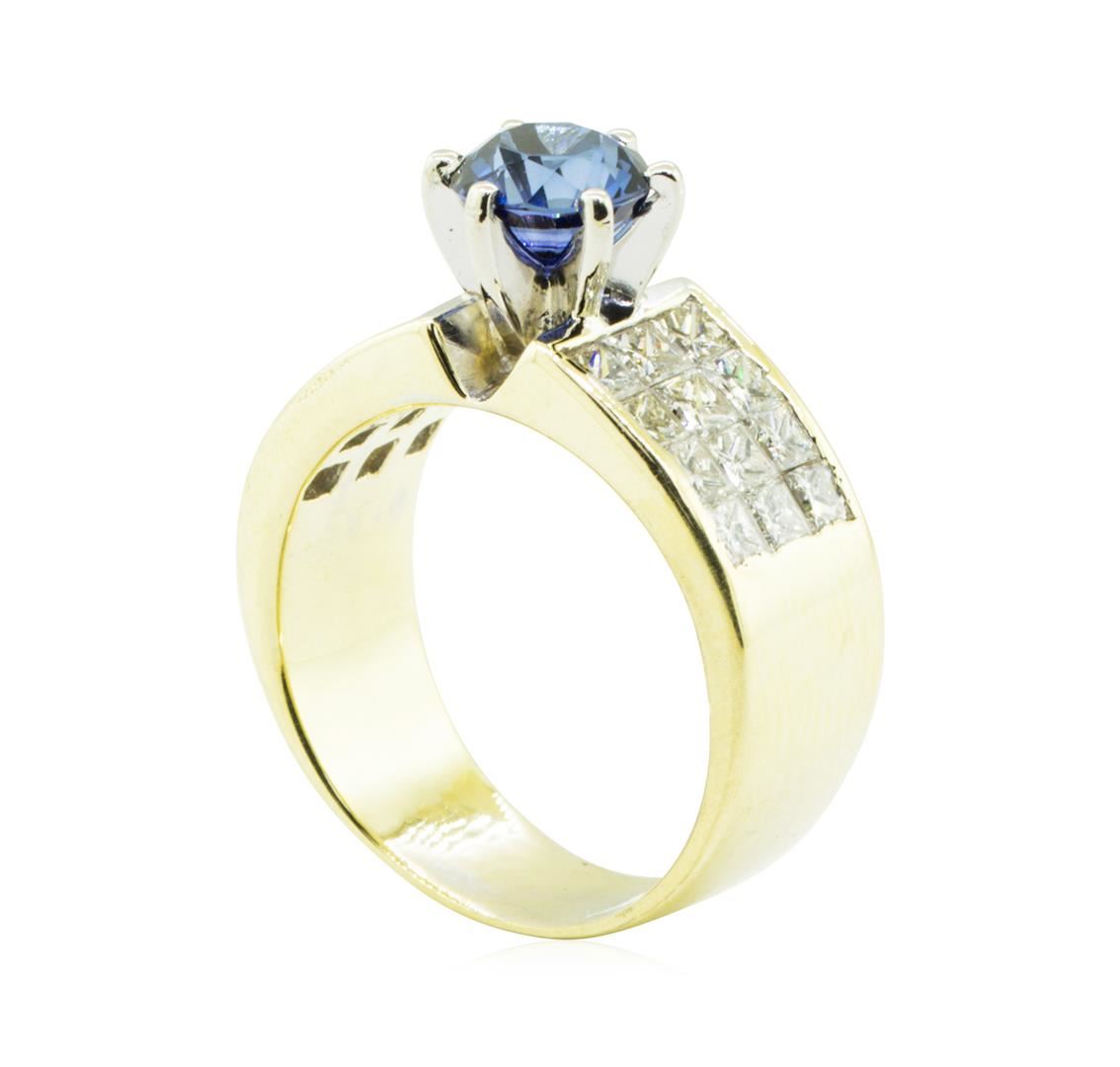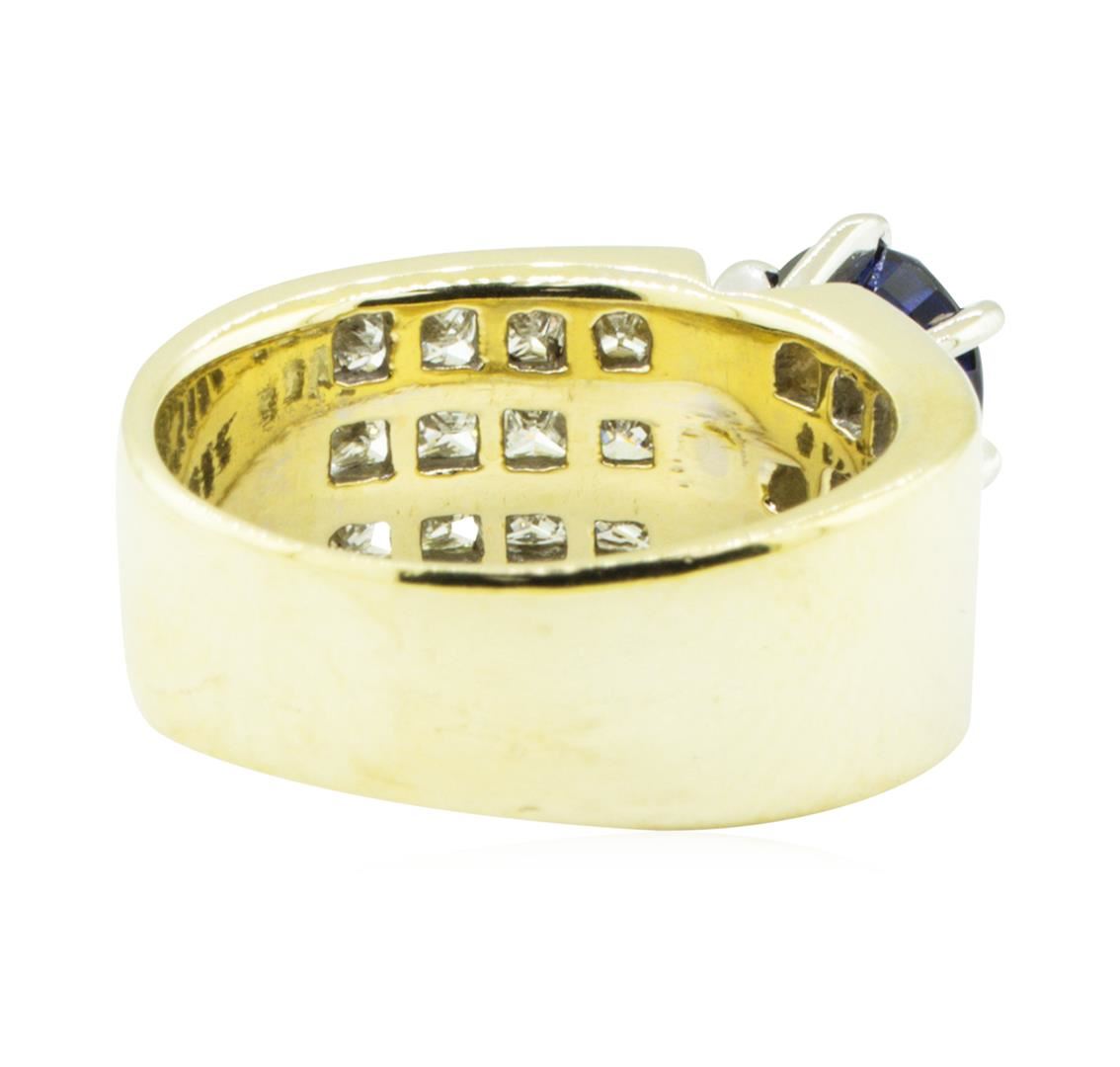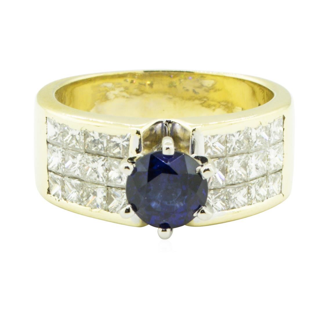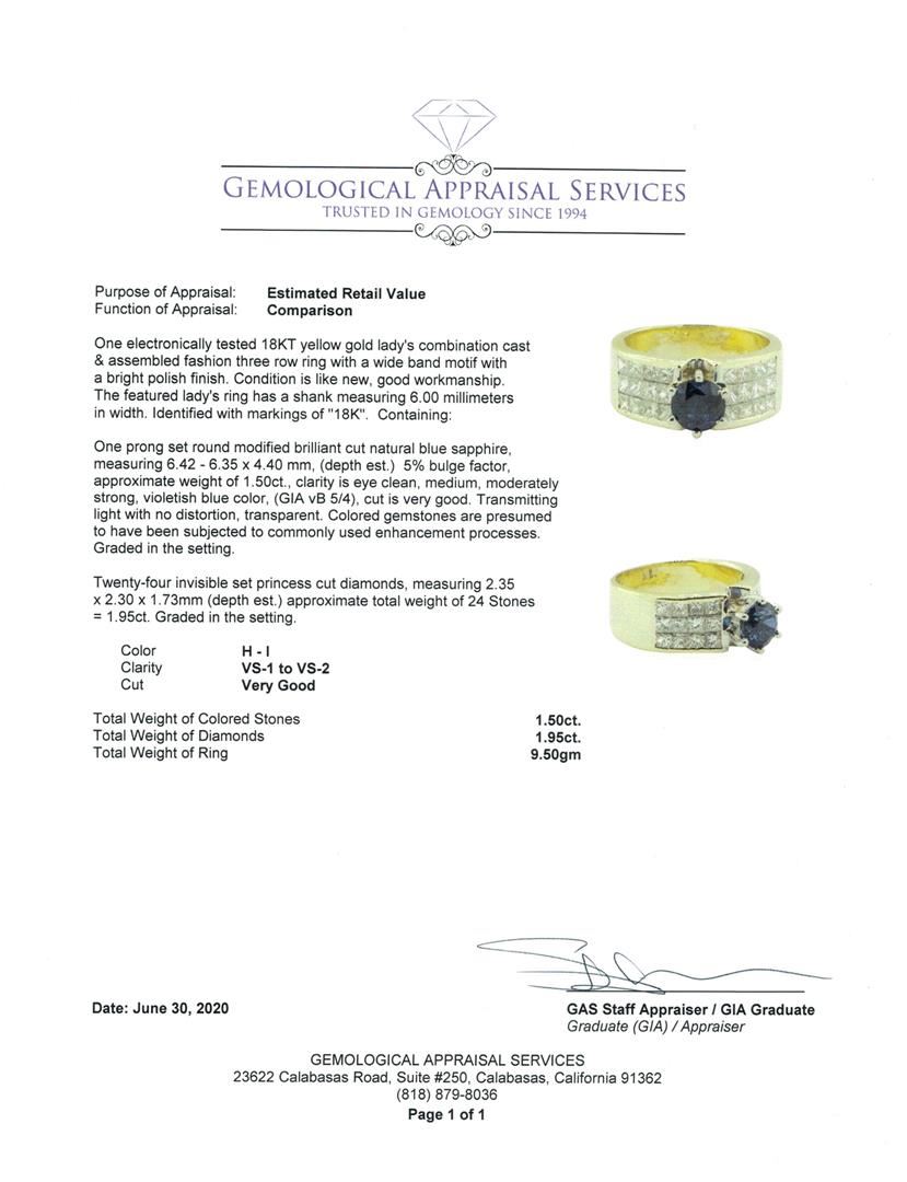 One electronically tested 18KT yellow gold lady's combination cast & assembled fashion three row ring with a wide band motif with a bright polish finish. The featured lady's ring has a shank measuring 6.00 millimeters in width. Identified with markings of '18K'. Condition is like new, good workmanship. Containing: One prong set round modified brilliant cut natural blue sapphire, measuring 6.42 - 6.35 x 4.40 mm, (depth est.) 5%. bulge factor, approximate weight of 1.50ct., clarity is eye clean, medium, moderately strong, violetish blue color, (GIA vB 5/4), cut is very good. Transmitting light with no distortion, transparent. Colored gemstones are presumed to have been subjected to commonly used enhancement processes. Graded in the setting. Twenty-Four invisible set princess cut diamonds, measuring 2.35 x 2.30 x 1.73mm (depth est.) approximate total weight of 24 Stones = 1.95ct. Graded in the setting. Color H - I Clarity VS-1 to VS-2 Cut Very Good. Total Weight of Colored Stones 1.50ct.. Total Weight of Diamonds 1.95ct.. Total Weight of Ring 9.50gm GAS Appraised at $7520.00. GAS Appraised.