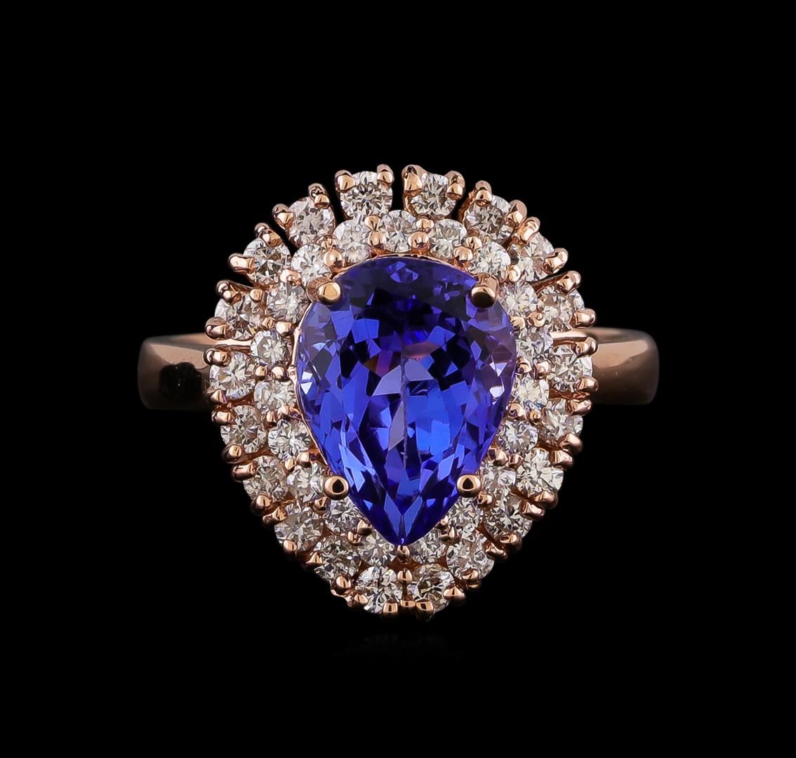 One electronically tested 14KT rose gold lady's cast fashion ring with a double basket halo with a bright polish finish. The featured lady's has a shank measuring 2.85 millimeters in width. Identified with markings of "K14". Condition is new, good workmanship. Containing: One prong set pear modified brilliant cut natural tanzanite, measuring 10.80 x 8.24 x 5.99mm, (depth est.) approximate weight of 3.45ct., clarity is eye clean, medium dark, moderately strong, bluish violet color, (GIA bV 6/4), cut is very good. Transmitting light with no distortion, transparent. Colored gemstones are presumed to have been subjected to commonly used enhancement processes. Graded in the setting. Twenty prong set round brilliant cut diamonds, measuring 1.90 - 1.85 x 1.17mm (depth est.) approximate total weight of 20 Stones = 0.50ct. Graded in the setting. Clarity: SI-1 to I-1. Color: H - I. Cut Good Nineteen prong set round brilliant cut diamonds, measuring 1.70 - 1.65 x 1.04mm (depth est.) approximate total weight of 19 Stones = 0.35ct. Graded in the setting. Clarity: SI-1 to SI-2. Color: H - I. Cut Good. Total Weight of Colored Stones 3.45ct. Total Weight of Diamonds 0.85ct. Total Weight of Ring 6.60gm. GAS Appraised.