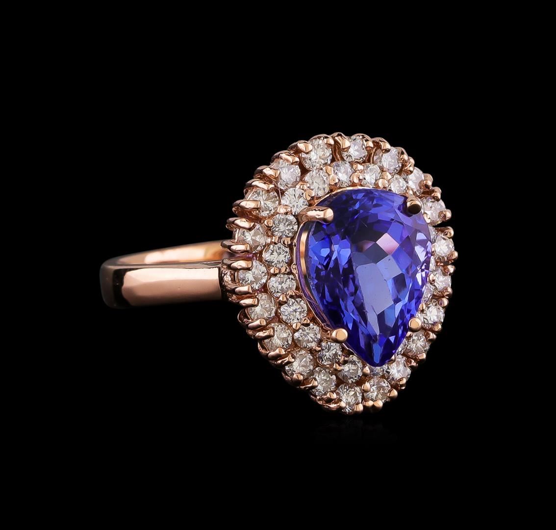 One electronically tested 14KT rose gold lady's cast fashion ring with a double basket halo with a bright polish finish. The featured lady's has a shank measuring 2.85 millimeters in width. Identified with markings of "K14". Condition is new, good workmanship. Containing: One prong set pear modified brilliant cut natural tanzanite, measuring 10.80 x 8.24 x 5.99mm, (depth est.) approximate weight of 3.45ct., clarity is eye clean, medium dark, moderately strong, bluish violet color, (GIA bV 6/4), cut is very good. Transmitting light with no distortion, transparent. Colored gemstones are presumed to have been subjected to commonly used enhancement processes. Graded in the setting. Twenty prong set round brilliant cut diamonds, measuring 1.90 - 1.85 x 1.17mm (depth est.) approximate total weight of 20 Stones = 0.50ct. Graded in the setting. Clarity: SI-1 to I-1. Color: H - I. Cut Good Nineteen prong set round brilliant cut diamonds, measuring 1.70 - 1.65 x 1.04mm (depth est.) approximate total weight of 19 Stones = 0.35ct. Graded in the setting. Clarity: SI-1 to SI-2. Color: H - I. Cut Good. Total Weight of Colored Stones 3.45ct. Total Weight of Diamonds 0.85ct. Total Weight of Ring 6.60gm. GAS Appraised.