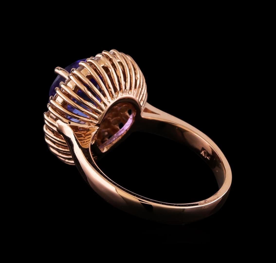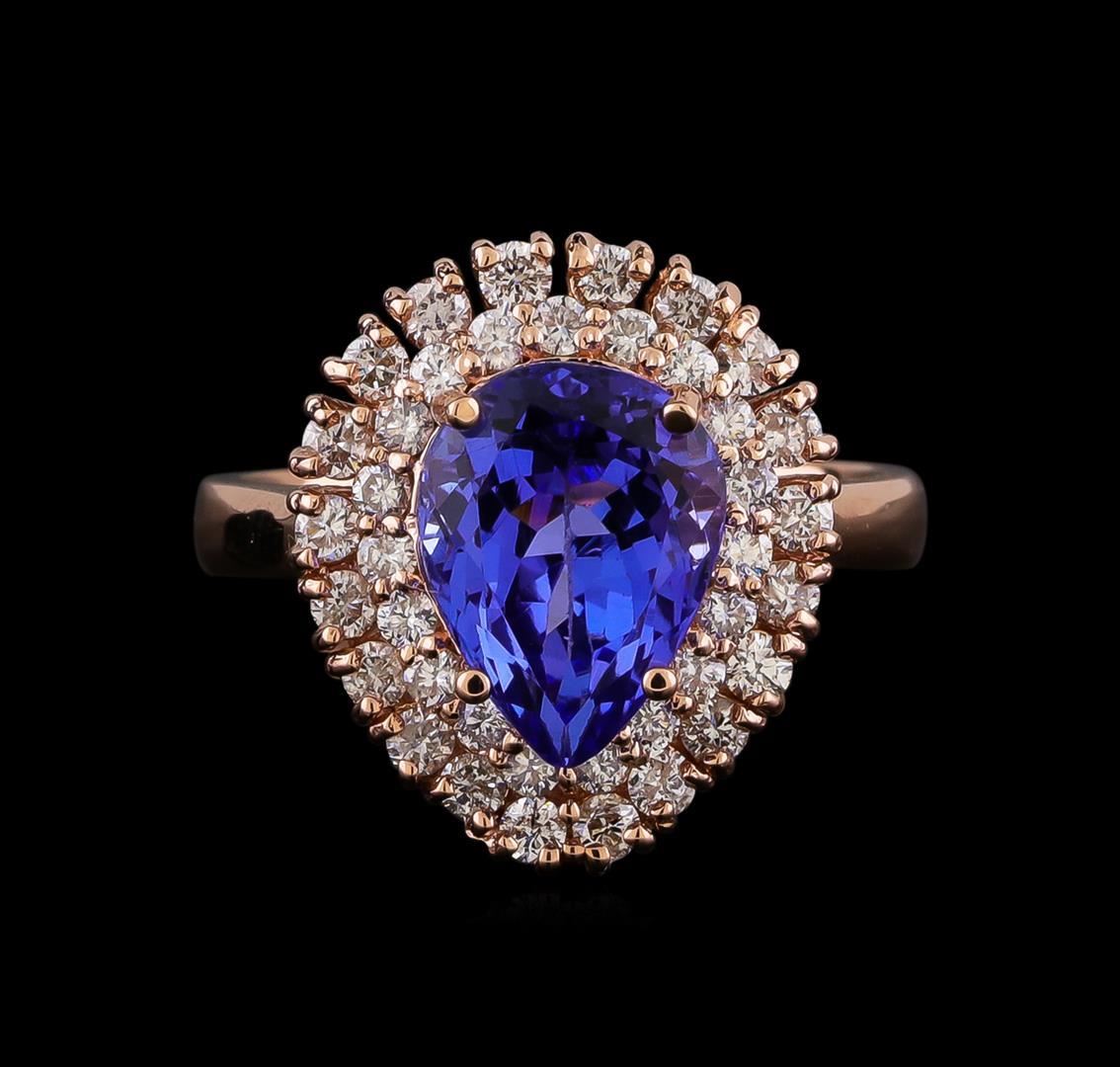 One electronically tested 14KT rose gold lady's cast fashion ring with a double basket halo with a bright polish finish. The featured lady's has a shank measuring 2.85 millimeters in width. Identified with markings of "K14". Condition is new, good workmanship. Containing: One prong set pear modified brilliant cut natural tanzanite, measuring 10.80 x 8.24 x 5.99mm, (depth est.) approximate weight of 3.45ct., clarity is eye clean, medium dark, moderately strong, bluish violet color, (GIA bV 6/4), cut is very good. Transmitting light with no distortion, transparent. Colored gemstones are presumed to have been subjected to commonly used enhancement processes. Graded in the setting. Twenty prong set round brilliant cut diamonds, measuring 1.90 - 1.85 x 1.17mm (depth est.) approximate total weight of 20 Stones = 0.50ct. Graded in the setting. Clarity: SI-1 to I-1. Color: H - I. Cut Good Nineteen prong set round brilliant cut diamonds, measuring 1.70 - 1.65 x 1.04mm (depth est.) approximate total weight of 19 Stones = 0.35ct. Graded in the setting. Clarity: SI-1 to SI-2. Color: H - I. Cut Good. Total Weight of Colored Stones 3.45ct. Total Weight of Diamonds 0.85ct. Total Weight of Ring 6.60gm.