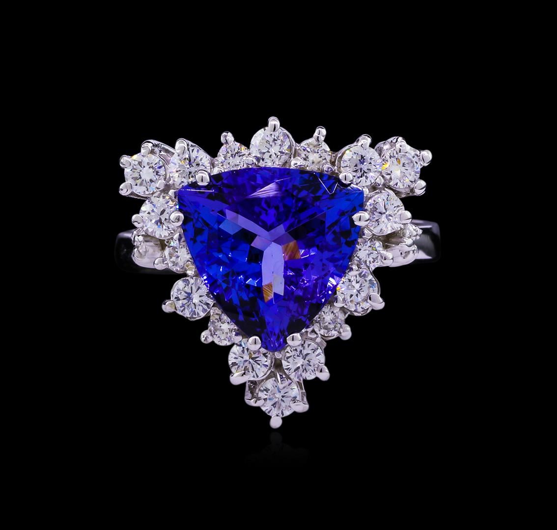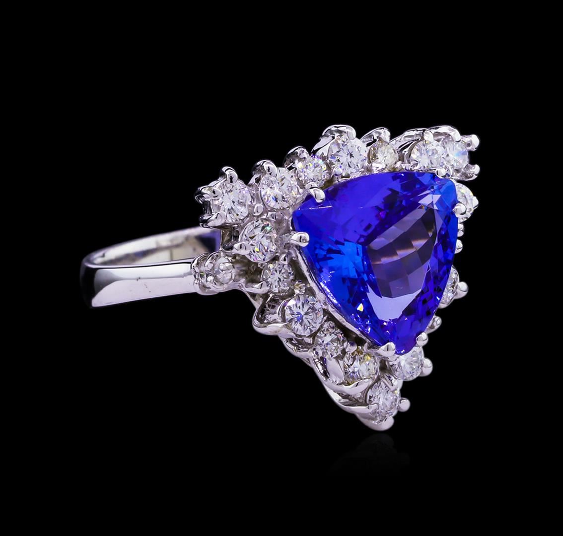 One electronically tested 14KT white gold lady's cast fashion ring with a basket halo with a bright polish finish. The featured lady's ring has a shank measuring 2.99 millimeters wide. Identified with markings of "K14". Condition is new, good workmanship. Containing: One prong set triangle modified brilliant cut natural tanzanite, measuring 10.60 x 10.41 x 5.42mm, approximate weight of 3.45ct., clarity is eye clean, type I, medium, moderately strong, violetish blue color, (GIA vB 5/4), cut is very good. Transmitting light with no distortion, transparent. Colored gemstones are presumed to have been subjected to commonly used enhancement processes. Graded in the setting. Twelve prong set round brilliant cut diamonds, measuring 2.40 - 2.30 x 1.46mm (depth est.) approximate total weight of 12 Stones = 0.59ct. Graded in the setting. Clarity: VS-2 to SI-1. Color: G - Good Six prong set round brilliant cut diamonds, measuring 2.00 - 1.90 x 1.17mm (depth est.) approximate total weight of 6 Stones = 0.16ct. Graded in the setting. Clarity: VS-2 to SI-2. Color: H - I. Cut Good Four prong set round brilliant cut diamonds, measuring 1.60 - 1.55 x 0.98mm (depth est.) approximate total weight of 4 Stones = 0.06ct. Graded in the setting. Clarity: SI-1 to SI-2. Color: H - I. Cut Good. Total Weight of Colored Stones 3.45ct. Total Weight of Diamonds 0.81ct. Total Weight of Ring 6.20gm. GAS Appraised at $8,425.00.