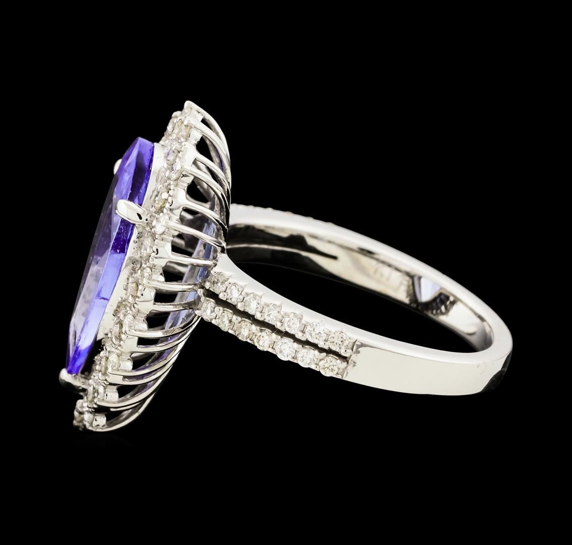 One electronically tested 14KT white gold lady's cast fashion ring with a staggered double basket halo with a bright polish with milgrain detailing finish. The featured lady's ring has a split shank measuring 2.23 millimeters wide. Identified with markings of 'K14'. Condition is new, good workmanship. Containing: One prong set pear modified brilliant cut natural tanzanite, measuring 14.90 x 8.60 x 4.04mm, (depth est.) approximate weight of 3.45ct., clarity is eye clean, medium light, moderately strong, violetish blue color, (GIA vB 4/4), cut is very good. Transmitting light with no distortion, transparent. Colored gemstones are presumed to have been subjected to commonly used enhancement processes. Graded in the setting. Sixty prong set round brilliant cut diamonds, measuring 1.30 - 1.20 x 0.78mm (depth est.) approximate total weight of 60 Stones = 0.46ct. Graded in the setting. Clarity VS-2 to SI-1. Color: H - I Cut Good. Total Weight of Colored Stones 3.45ct.. Total Weight of Diamonds 0.46ct.. Total Weight of Ring 5.90gm. GAS Appraised at $5,875.00.