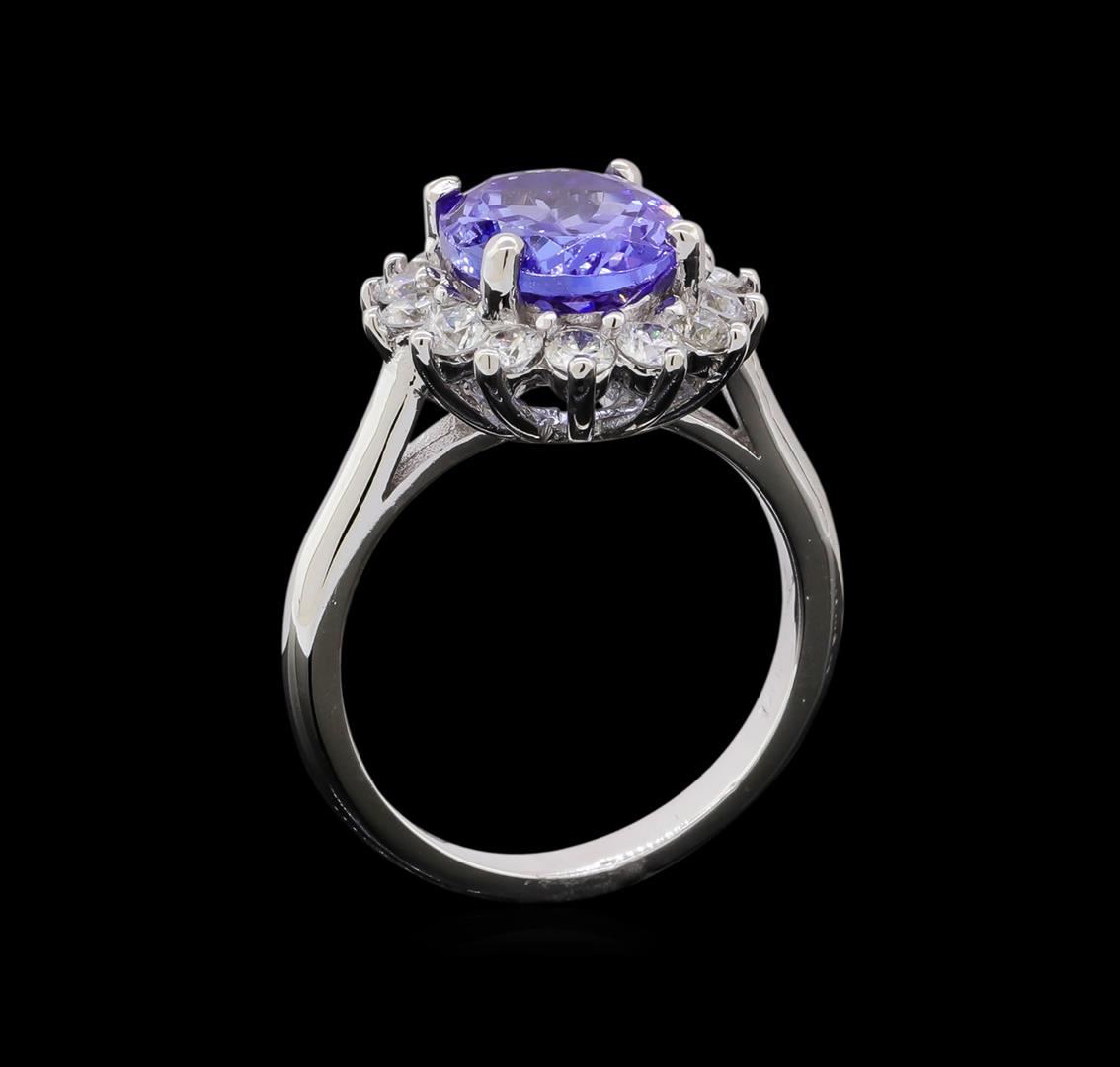 One electronically tested 14KT white gold lady's cast fashion ring with a cathedral basket halo with a bright polish finish. The featured lady's ring has a shank measuring 2.33 millimeters in width. Identified with markings of '14K'. Condition is new, good workmanship. Containing: One prong set oval modified brilliant cut natural tanzanite, measuring 10.93 x 8.42 x 4.58mm, (depth est.) 10%. bulge factor, approximate weight of 3.45ct., clarity is eye clean, light, moderately strong, bluish violet color, (GIA bV 3/4), cut is good. Transmitting light with no distortion, transparent. Colored gemstones are presumed to have been subjected to commonly used enhancement processes. Graded in the setting. Fourteen prong set round brilliant cut diamonds, measuring 2.60 - 2.55 x 1.55mm (depth est.) approximate total weight of 14 Stones = 0.88ct. Graded in the setting. Clarity SI-1 to I-1. Color: H - I Cut Good. Total Weight of Colored Stones 3.45ct.. Total Weight of Diamonds 0.88ct.. Total Weight of Ring 5.70gm. GAS Appraised at $6,080.00.