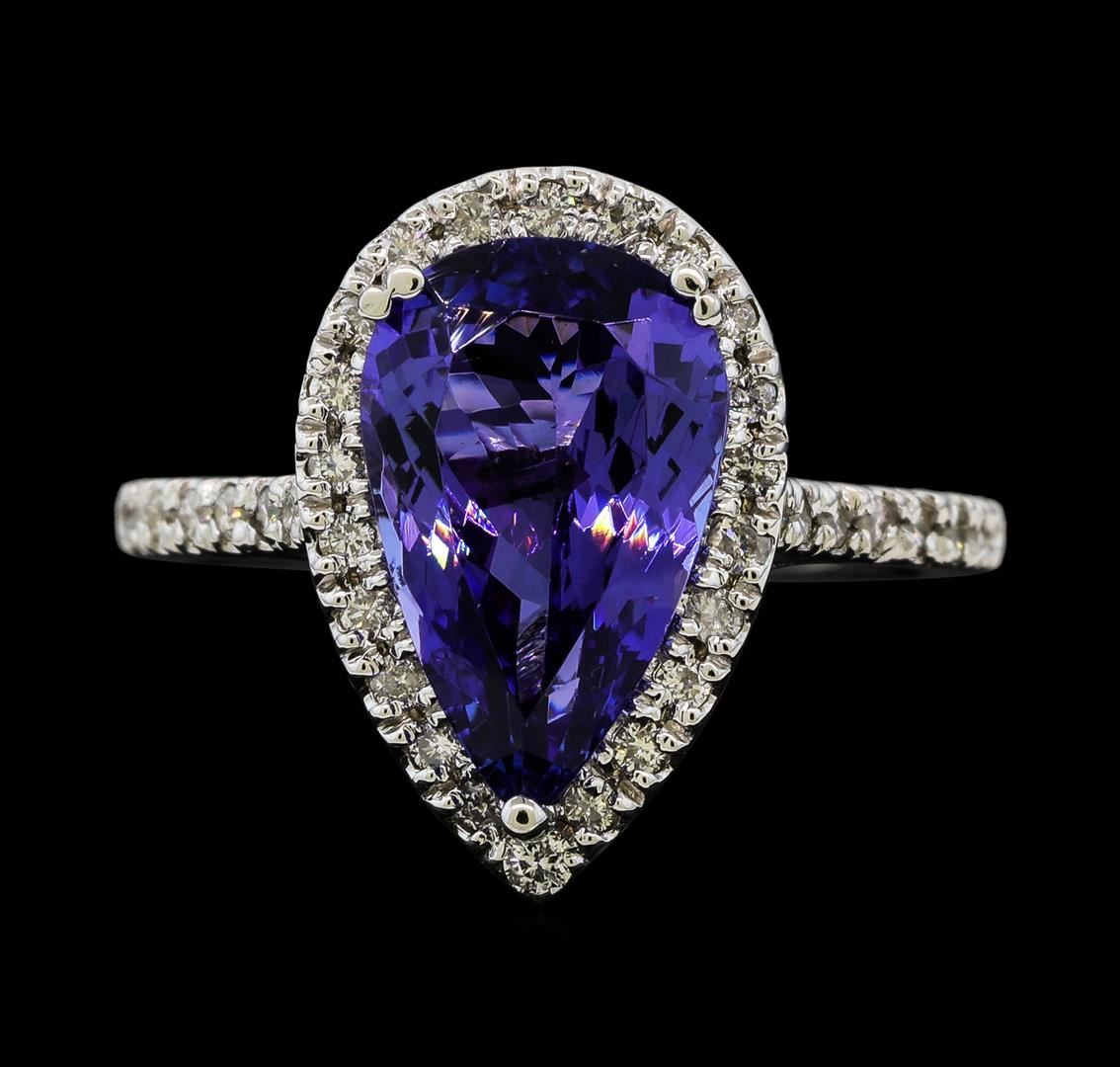 One electronically tested 14KT white gold lady's cast fashion ring with a cathedral halo with a bright polish finish. The featured lady's ring has a shank measuring 1.80 millimeters wide. Identified with markings of '14K'. Condition is new, good workmanship. Containing: One prong set pear modified brilliant cut natural tanzanite, measuring 12.65 x 8.04 x 5.00mm, (depth est.) approximate weight of 3.45ct., clarity is eye clean, medium dark, moderately strong, violetish blue color, (GIA vB 6/4), cut is very good. Transmitting light with no distortion, transparent. Colored gemstones are presumed to have been subjected to commonly used enhancement processes. Graded in the setting. Thirty-Eight prong set round brilliant cut diamonds, measuring 1.40 - 1.30 x 0.84mm (depth est.) approximate total weight of 38 Stones = 0.35ct. Graded in the setting. Clarity SI-1 to I-1. Color: G - I Cut Good. Total Weight of Colored Stones 3.45ct.. Total Weight of Diamonds 0.35ct.. Total Weight of Ring 4.20gm. GAS Appraised at $7,655.00.
