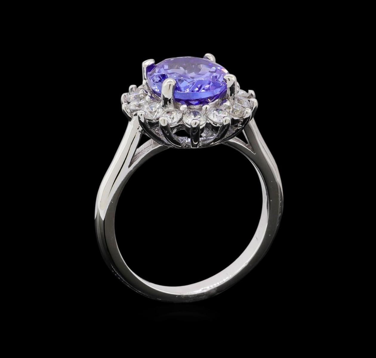 One electronically tested 14KT white gold lady's cast fashion ring with a cathedral basket halo with a bright polish finish. The featured lady's ring has a shank measuring 2.33 millimeters in width. Identified with markings of '14K'. Condition is new, good workmanship. Containing: One prong set oval modified brilliant cut natural tanzanite, measuring 10.93 x 8.42 x 4.58mm, (depth est.) 10%. bulge factor, approximate weight of 3.45ct., clarity is eye clean, light, moderately strong, bluish violet color, (GIA bV 3/4), cut is good. Transmitting light with no distortion, transparent. Colored gemstones are presumed to have been subjected to commonly used enhancement processes. Graded in the setting. Fourteen prong set round brilliant cut diamonds, measuring 2.60 - 2.55 x 1.55mm (depth est.) approximate total weight of 14 Stones = 0.88ct. Graded in the setting. Clarity SI-1 to I-1. Color: H - I Cut Good. Total Weight of Colored Stones 3.45ct.. Total Weight of Diamonds 0.88ct.. Total Weight of Ring 5.70gm. GAS Appraised.