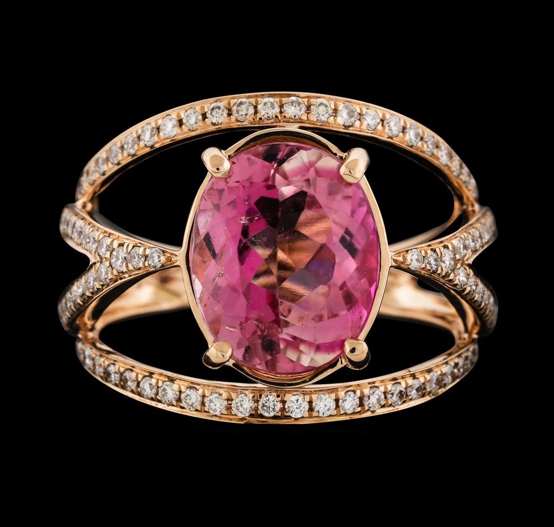 One electronically tested 14KT rose gold lady's cast fashion ring with a double split shank with a bright polish finish. The featured lady's ring has a shank measuring 2.53 millimeters wide. Identified with markings of '14K'. Condition is new, good workmanship. Containing: One prong set oval modified brilliant cut natural pink tourmaline, measuring 10.65 x 8.64 x 5.56mm, (depth est.) 5%. bulge factor, approximate weight of 3.45ct., clarity is slightly included, medium, moderately strong, slightly purplish red color, (GIA slpR 5/4), cut is very good. Transmitting light with a minimum of distortion, transparent. Colored gemstones are presumed to have been subjected to commonly used enhancement processes. Graded in the setting. Seventy-Eight prong set round brilliant cut diamonds, measuring 1.15 - 1.10 x 0.70mm (depth est.) approximate total weight of 78 Stones = 0.41ct. Graded in the setting. Clarity VS-2 to SI-1. Color: G - H Cut Good. Total Weight of Colored Stones 3.45ct.. Total Weight of Diamonds 0.41ct.. Total Weight of Ring 4.80gm. GAS Appraised at $4,975.00.