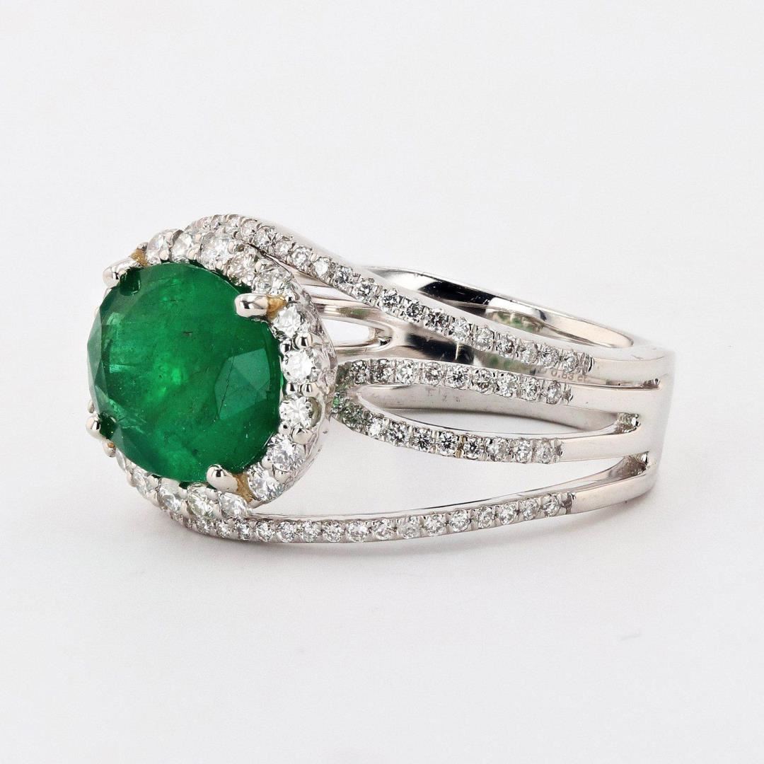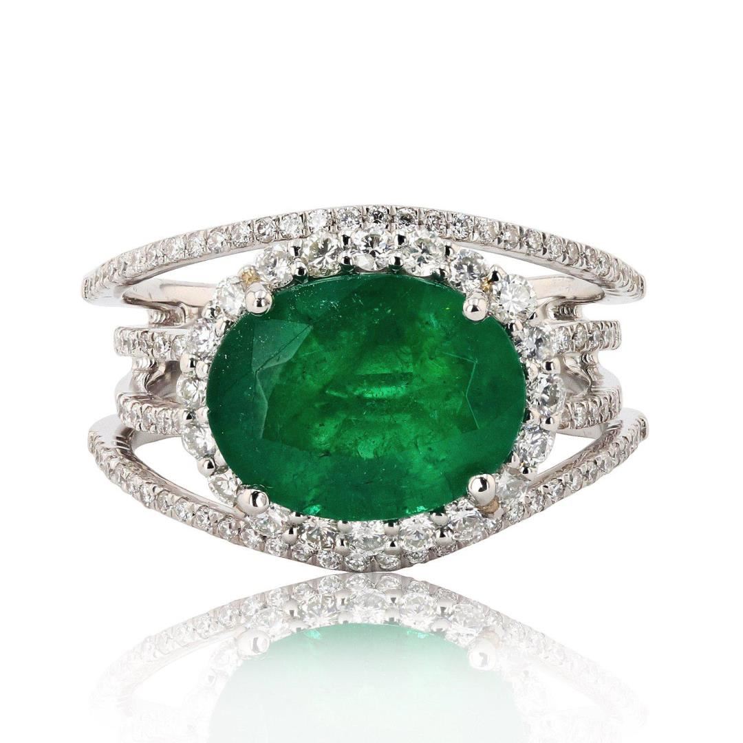 One polished, stamped, and tested platinum ring with a bright finish. The ring is mounted with: 1 genuine emerald center stone weighing approximately 3.46 carat, and 124 genuine round diamonds weighing approximately 0.83 carats. This item weighs 11.1 grams, condition is new, excellent workmanship. MAIN GEMSTONE Species: Natural BerylVariety: EmeraldShape: OvalCutting Style: Brilliant Cut CrownStep Cut PavilionMeasurements: 12mm x 9.3mmWeight: 3.46 caratColor: GreenCut Grade: Very GoodRefractive Index: 1.564 - 1.595 DRBirefringence: 0.005 to 0.009Hardness: 7.5 - 8 ADJACENT GEMSTONES ON RING Identity: Natural DiamondShape: RoundCutting Style: Brilliant CutQuantity: 124 Diamondsmeasurement: 1.0mm to 1.8mmTotal Weight: 0.83 caratsColor Grade:G - HClarity Grade: SI1 to SI2Refractive Index: 2.418Hardness: 10EMERALD WEIGHT: 3.46 ct TOTAL DIAMOND WEIGHT: 0.83 cts WEIGHT OF ITEM: 11.1 grams METAL: Platinum Size: 6 3/4
