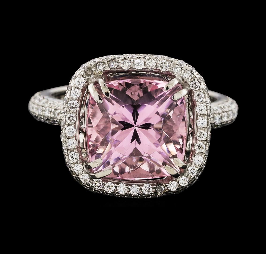 One electronically tested 18KT white gold lady's cast fashion ring with a cushion basket halo with a bright polish finish. The featured lady's ring has a shank measuring 2.36 millimeters wide. Condition is used, good workmanship. Containing: One prong set square cushion modified brilliant cut natural morganite, measuring 8.99 x 8.96 x 7.22mm, (depth est.) approximate weight of 3.46ct., clarity is eye clean, light, moderately strong, slightly purplish red color, (GIA slpR 3/4), cut is good. Transmitting light with no distortion, transparent. Colored gemstones are presumed to have been subjected to commonly used enhancement processes. Graded in the setting. Two Hundred Twenty prong set round brilliant cut diamonds, measuring 1.10 - 1.05 x 0.66mm (depth est.) approximate total weight of 220 Stones = 1.00ct. Graded in the setting. Clarity VS-2 to SI-2. Color: H - I Cut Good. Total Weight of Colored Stones 3.46ct.. Total Weight of Diamonds 1.00ct.. Total Weight of Ring 5.00gm. GAS Appraised at $6,680.00.