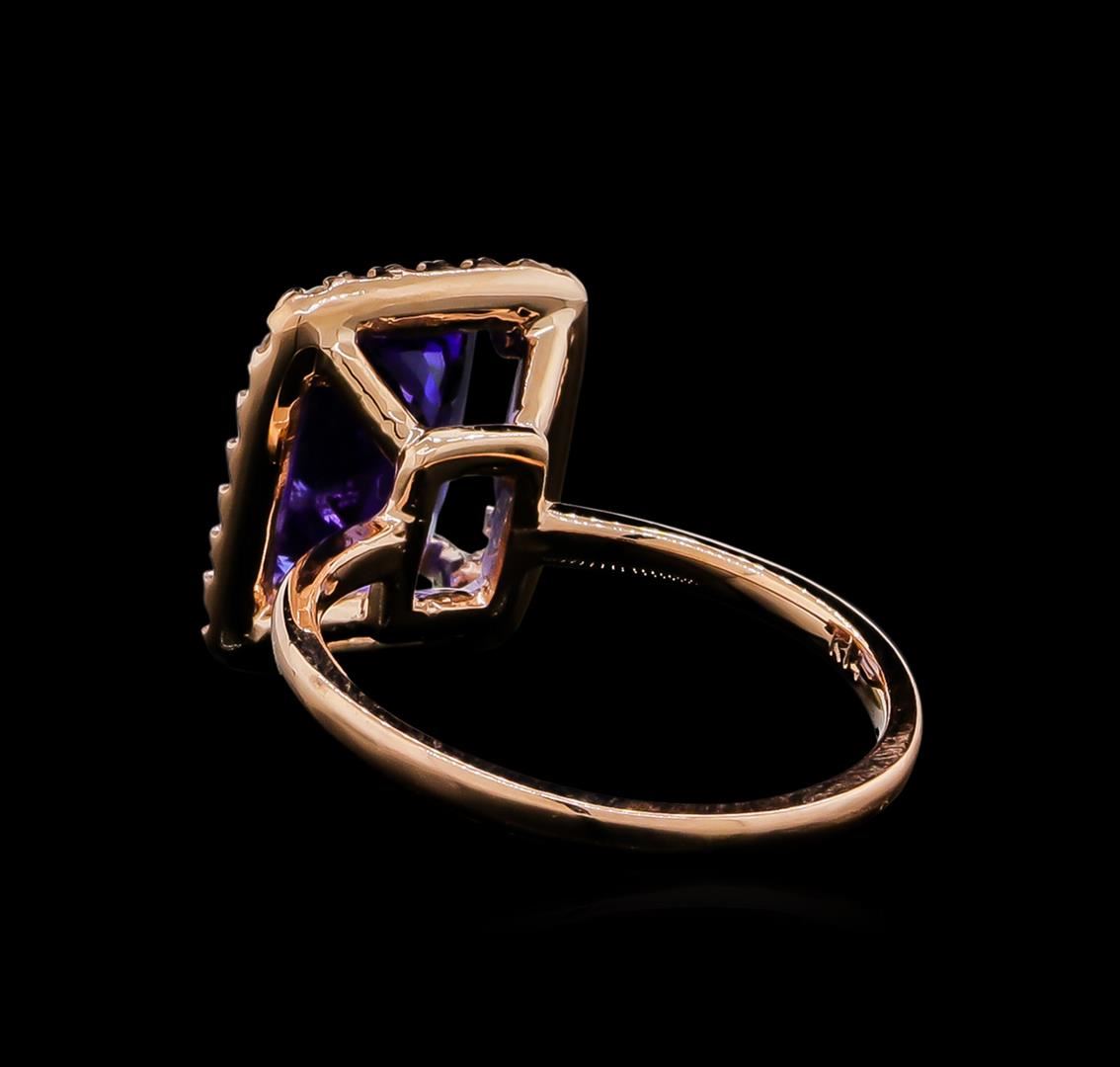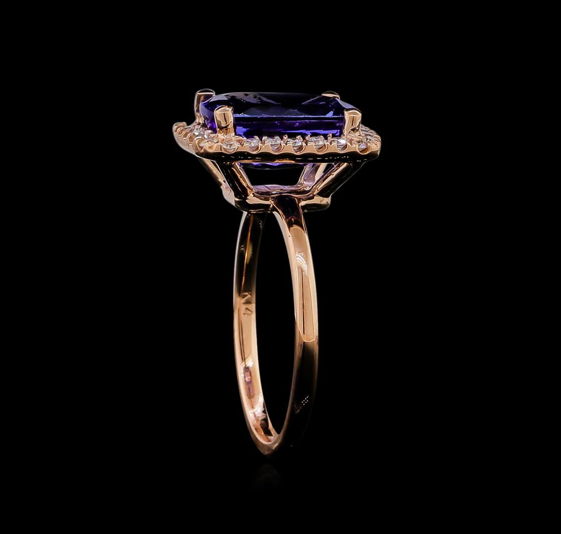One ring featuring: 14KT rose gold weighing 3.74 grams containing one tanzanite with a total weight of 3.46ct and side diamonds with a total weight of 0.32ct.