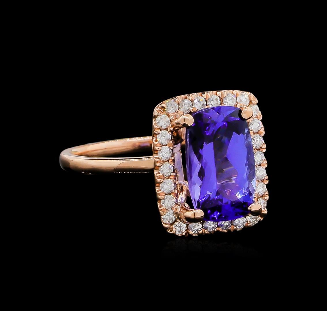 One ring featuring: 14KT rose gold weighing 3.74 grams containing one tanzanite with a total weight of 3.46ct and side diamonds with a total weight of 0.32ct.