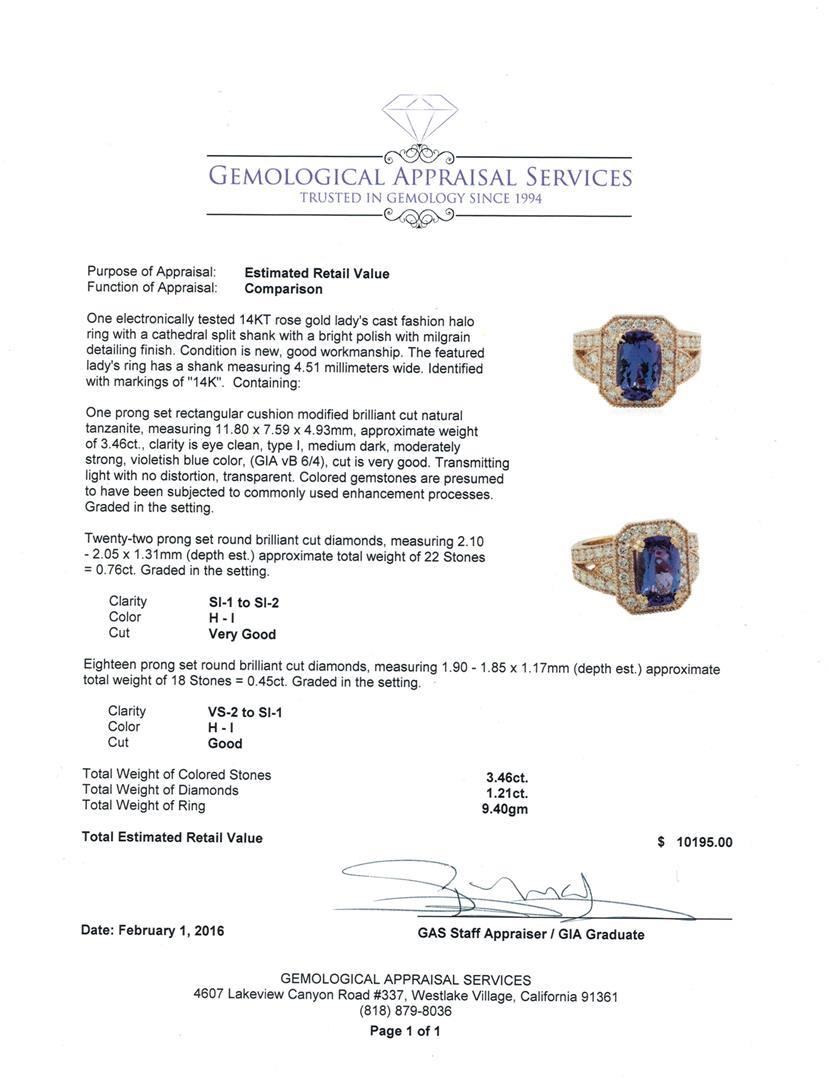 One electronically tested 14KT rose gold lady's cast fashion halo ring with a cathedral split shank with a bright polish with milgrain detailing finish. The featured lady's ring has a shank measuring 4.51 millimeters wide. Identified with markings of "14K". Condition is new, good workmanship. Containing: One prong set rectangular cushion modified brilliant cut natural tanzanite, measuring 11.80 x 7.59 x 4.93mm, approximate weight of 3.46ct., clarity is eye clean, type I, medium dark, moderately strong, violetish blue color, (GIA vB 6/4), cut is very good. Transmitting light with no distortion, transparent. Colored gemstones are presumed to have been subjected to commonly used enhancement processes. Graded in the setting. Twenty-Two prong set round brilliant cut diamonds, measuring 2.10 - 2.05 x 1.31mm (depth est.) approximate total weight of 22 Stones = 0.76ct. Graded in the setting. Clarity: SI-1 to SI-2. Color: H - I. Cut Very Good Eighteen prong set round brilliant cut diamonds, measuring 1.90 - 1.85 x 1.17mm (depth est.) approximate total weight of 18 Stones = 0.45ct. Graded in the setting. Clarity: VS-2 to SI-1. Color: H - I. Cut Good. Total Weight of Colored Stones 3.46ct. Total Weight of Diamonds 1.21ct. Total Weight of Ring 9.40gm. GAS Appraised.