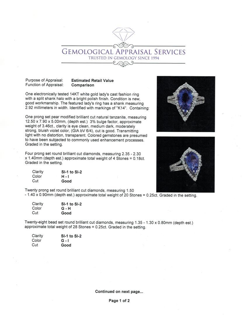 One electronically tested 14KT white gold lady's cast fashion ring with a split shank halo with a bright polish finish. The featured lady's ring has a shank measuring 2.92 millimeters in width. Identified with markings of "K14". Condition is new, good workmanship. Containing: One prong set pear modified brilliant cut natural tanzanite, measuring 12.50 x 7.90 x 5.00mm, (depth est.) 3%. bulge factor, approximate weight of 3.46ct., clarity is eye clean, medium dark, moderately strong, bluish violet color, (GIA bV 6/4), cut is good. Transmitting light with no distortion, transparent. Colored gemstones are presumed to have been subjected to commonly used enhancement processes. Graded in the setting. Four prong set round brilliant cut diamonds, measuring 2.35 - 2.30 x 1.40mm (depth est.) approximate total weight of 4 Stones = 0.18ct. Graded in the setting. Clarity: SI-1 to SI-2. Color: H - I. Cut Good Twenty prong set round brilliant cut diamonds, measuring 1.50 - 1.40 x 0.90mm (depth est.) approximate total weight of 20 Stones = 0.25ct. Graded in the setting. Clarity: SI-1 to SI-2. Color: G - Good Twenty-Eight bead set round brilliant cut diamonds, measuring 1.35 - 1.30 x 0.80mm (depth est.) approximate total weight of 28 Stones = 0.25ct. Graded in the setting. Clarity: SI-1 to SI-2. Color: G - I. Cut Good. Total Weight of Colored Stones 3.46ct. Total Weight of Diamonds 0.68ct. Total Weight of Ring 5.80gm. GAS Appraised at $8,405.00.
