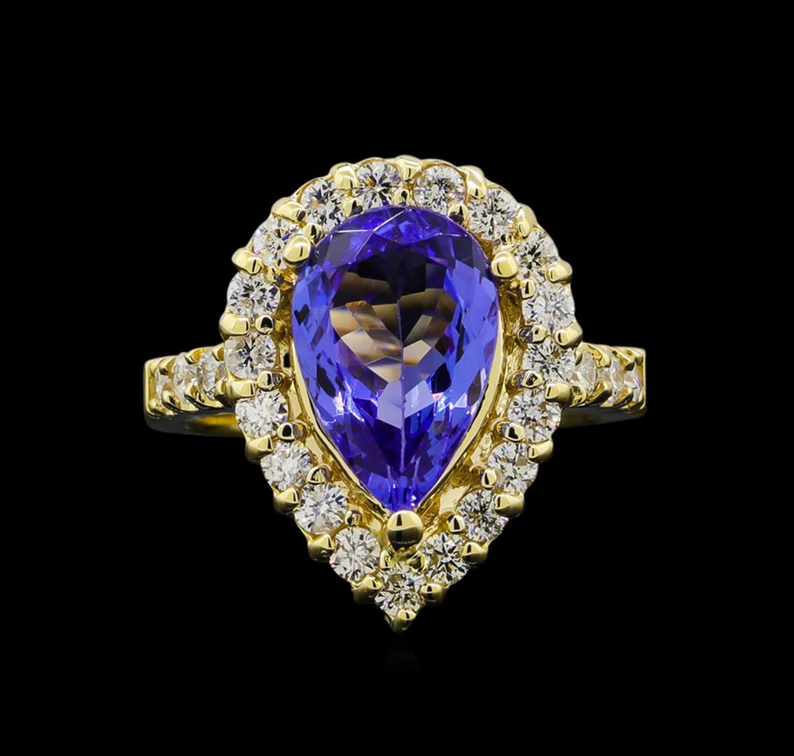 One electronically tested 14KT yellow gold lady's cast fashion ring with a basket halo with a bright polish finish. The featured lady's ring has a shank measuring 2.99 millimeters wide. Identified with markings of 'K14'. Condition is new, good workmanship. Containing: One prong set pear modified brilliant cut natural tanzanite, measuring 12.60 x 8.35 x 4.76mm, (depth est.) approximate weight of 3.46ct., clarity is eye clean, medium light, moderately strong, violetish blue color, (GIA vB 4/4), cut is very good. Transmitting light with no distortion, transparent. Colored gemstones are presumed to have been subjected to commonly used enhancement processes. Graded in the setting. Twenty-Five prong set round brilliant cut diamonds, measuring 2.20 - 2.15 x 1.35mm (depth est.) approximate total weight of 25 Stones = 0.98ct. Graded in the setting. Clarity SI-1 to SI-2. Color: H - I Cut Good. Total Weight of Colored Stones 3.46ct.. Total Weight of Diamonds 0.98ct.. Total Weight of Ring 7.90gm. GAS Appraised at $8,005.00.