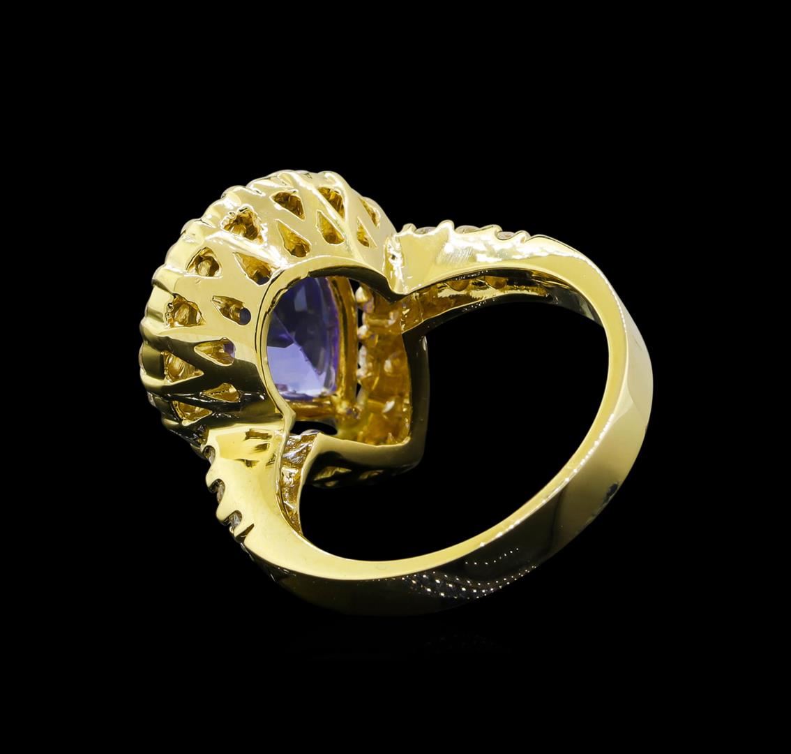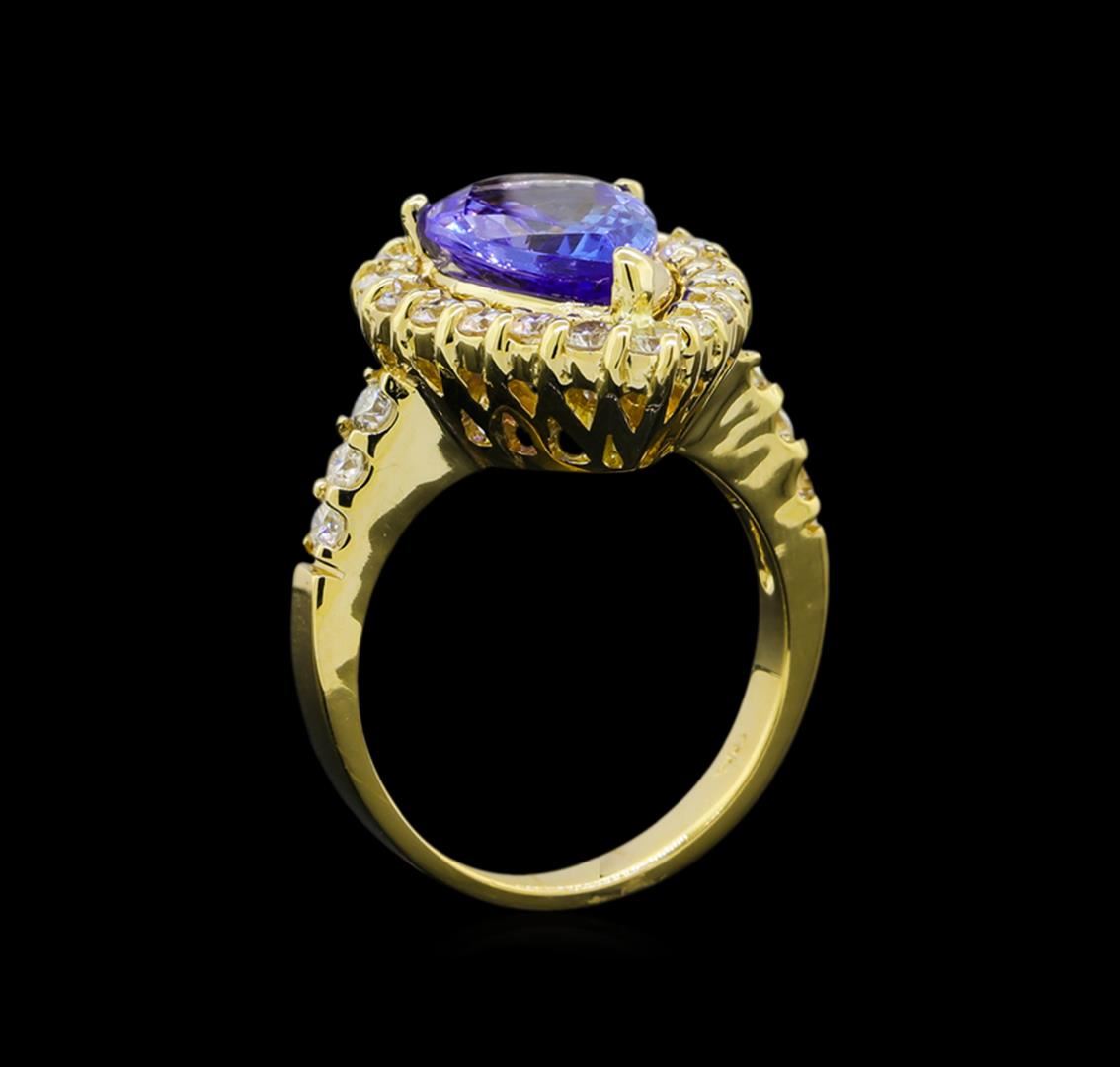 One electronically tested 14KT yellow gold lady's cast fashion ring with a basket halo with a bright polish finish. The featured lady's ring has a shank measuring 2.99 millimeters wide. Identified with markings of 'K14'. Condition is new, good workmanship. Containing: One prong set pear modified brilliant cut natural tanzanite, measuring 12.60 x 8.35 x 4.76mm, (depth est.) approximate weight of 3.46ct., clarity is eye clean, medium light, moderately strong, violetish blue color, (GIA vB 4/4), cut is very good. Transmitting light with no distortion, transparent. Colored gemstones are presumed to have been subjected to commonly used enhancement processes. Graded in the setting. Twenty-Five prong set round brilliant cut diamonds, measuring 2.20 - 2.15 x 1.35mm (depth est.) approximate total weight of 25 Stones = 0.98ct. Graded in the setting. Clarity SI-1 to SI-2. Color: H - I Cut Good. Total Weight of Colored Stones 3.46ct.. Total Weight of Diamonds 0.98ct.. Total Weight of Ring 7.90gm. GAS Appraised at $8,005.00.