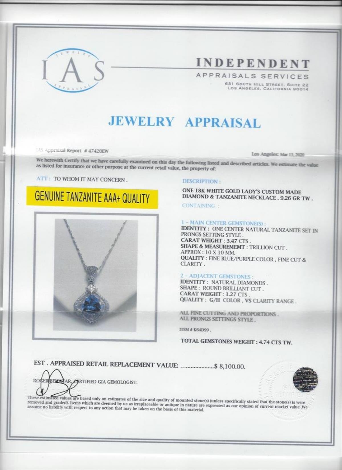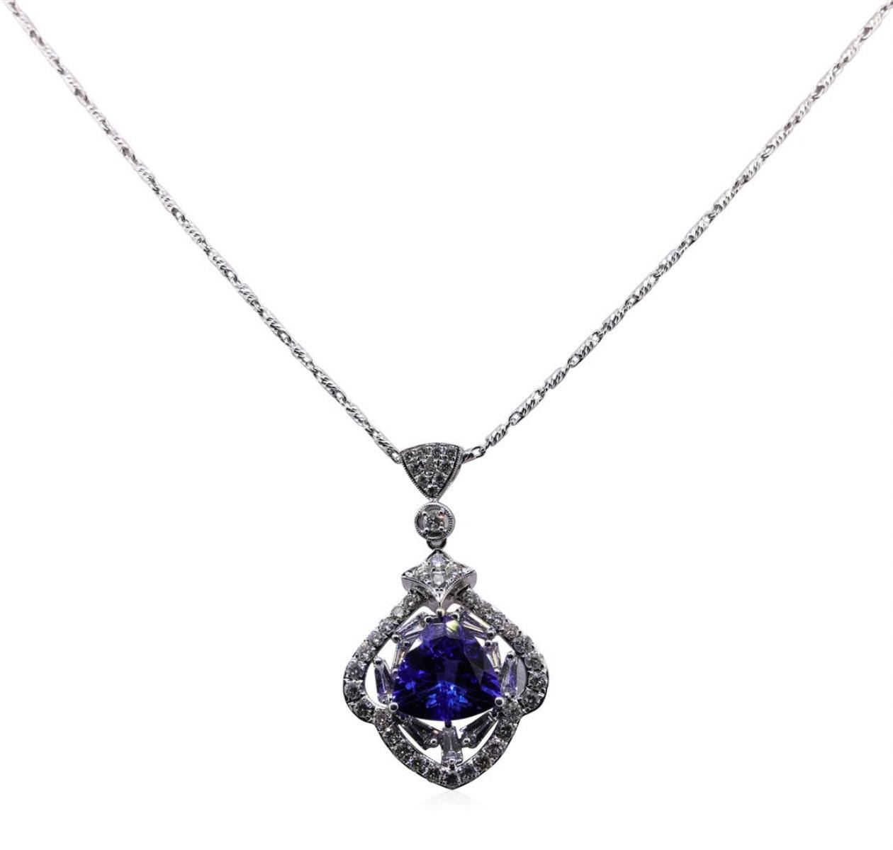 One 3.47ct Tanzanite and Diamond Pendant With Chain - 18KT White Gold. IAS certified. See Appraisal for more details.