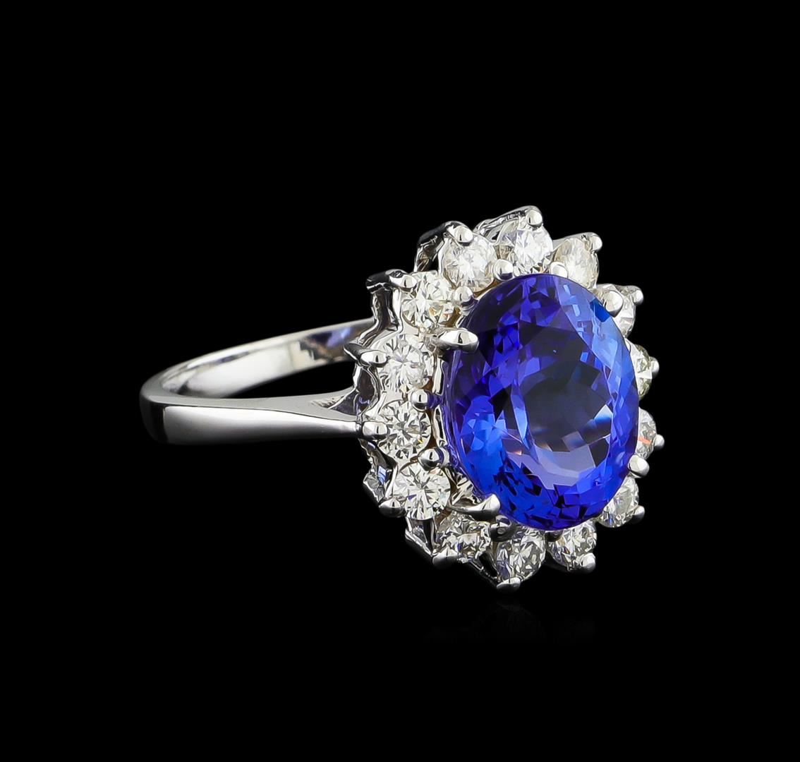 One electronically tested 14KT white gold ladies cast & assembled tanzanite and diamond ring with a bright polish finish. The featured tanzanite is set within a diamond floret, completed by a one and one-half millimeter wide band. Identified with markings of "K14". Condition is new, good workmanship. Containing: One prong set oval mixed cut natural tanzanite, measuring 10.30 x 8.50 x 5.60mm, exact weight 3.47ct., clarity is eye clean, type I, medium dark, very slightly grayish, violetish blue color, (GIA vB 6/3), cut is good. Transmitting light with no distortion, transparent. Graded in the setting. Tanzanite is a very rare gemstone that is only found in the country of Tanzania. Originally discovered in 1967. Tiffany & Company, named the stone Tanzanite. It is found in the Usumburu Mountains that border the Umba Valley of northern Tanzania. Tanzanite occurs in gray, brown, violet, blue, reddish-purple, & green. The gem is interesting because of its exceptional pleochroism. Rotated in different directions a tanzanite will exhibit multiple changes of color. Tanzanite has a low tolerance to ultrasonic cleaning, and should not be cleaned using this method. Fourteen prong set round brilliant cut diamonds, measuring 2.40 - 2.35 x 1.43mm exact total weight 14 Stones = 0.70ct. Graded in the setting. Clarity: SI-2 to I-2. Color: G - I. Total Weight of Colored Stones 3.47ct. Total Weight of Diamonds 0.70ct. Total Weight of Ring 4.32gm. AIG Appraised at $9,990.00.