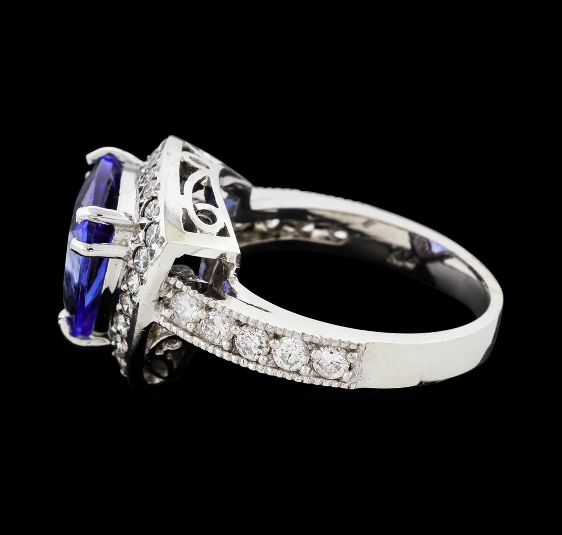One electronically tested 14KT white gold lady's cast fashion ring with a cathedral halo with a bright polish with milgrain detailing finish. The featured lady's ring has a shank measuring 2.76 millimeters wide. Identified with markings of 'K14'. Condition is new, good workmanship. Containing: One prong set triangle modified brilliant cut natural tanzanite, measuring 11.76 x 11.48 x 4.97mm, (depth est.) approximate weight of 3.47ct., clarity is eye clean, medium dark, moderately strong, violetish blue color, (GIA vB 6/4), cut is very good. Transmitting light with no distortion, transparent. Colored gemstones are presumed to have been subjected to commonly used enhancement processes. Graded in the setting. Ten prong set round brilliant cut diamonds, measuring 2.30 - 2.20 x 1.40mm (depth est.) approximate total weight of 10 Stones = 0.43ct. Graded in the setting. Clarity SI-1 to SI-3. Color: H - I Cut Good Twenty-One bead set round brilliant cut diamonds, measuring 1.70 - 1.60 x 1.01mm (depth est.) approximate total weight of 21 Stones = 0.35ct. Graded in the setting. Clarity SI-1 to SI-3. Color: G - I Cut Good. Total Weight of Colored Stones 3.47ct.. Total Weight of Diamonds 0.78ct.. Total Weight of Ring 7.30gm. GAS Appraised at $9,075.00.