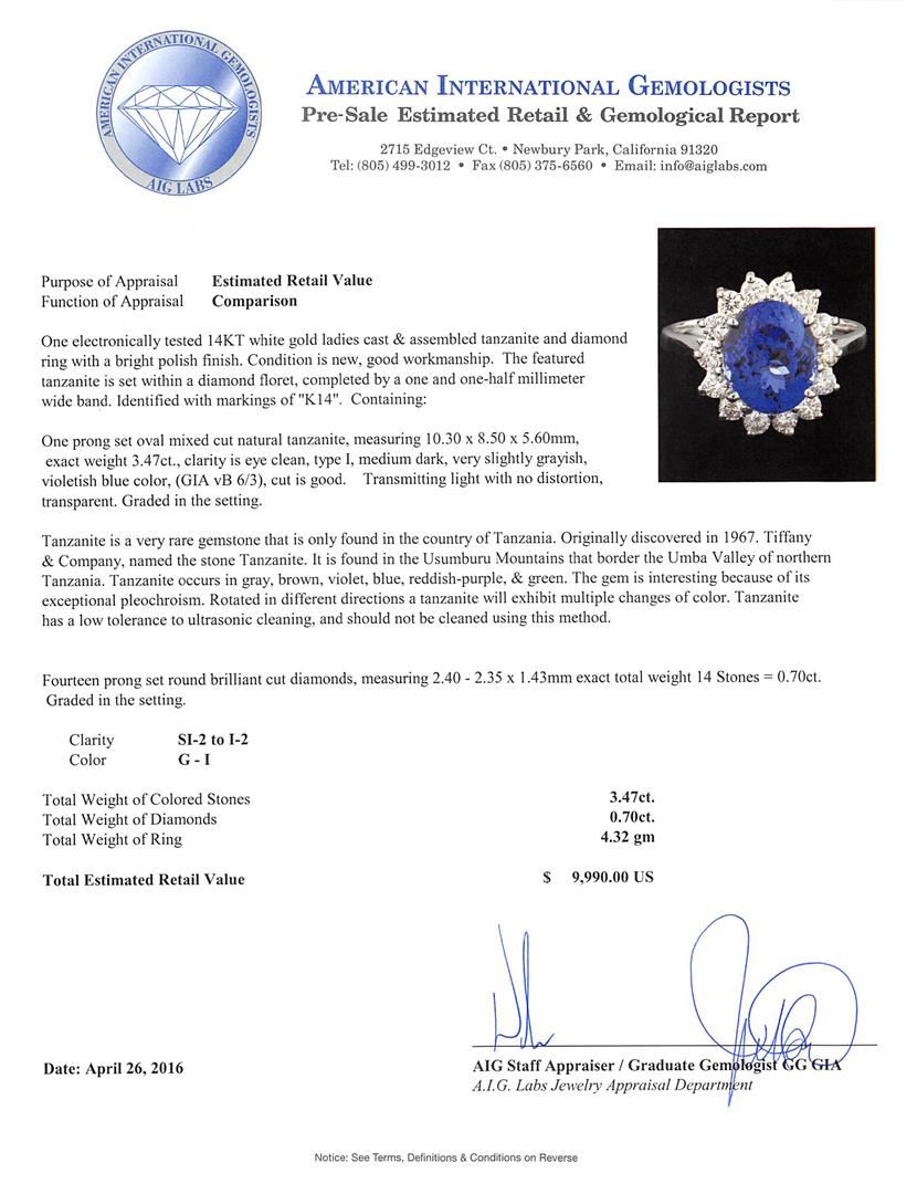 One electronically tested 14KT white gold ladies cast & assembled tanzanite and diamond ring with a bright polish finish. The featured tanzanite is set within a diamond floret, completed by a one and one-half millimeter wide band. Identified with markings of "K14". Condition is new, good workmanship. Containing: One prong set oval mixed cut natural tanzanite, measuring 10.30 x 8.50 x 5.60mm, exact weight 3.47ct., clarity is eye clean, type I, medium dark, very slightly grayish, violetish blue color, (GIA vB 6/3), cut is good. Transmitting light with no distortion, transparent. Graded in the setting. Tanzanite is a very rare gemstone that is only found in the country of Tanzania. Originally discovered in 1967. Tiffany & Company, named the stone Tanzanite. It is found in the Usumburu Mountains that border the Umba Valley of northern Tanzania. Tanzanite occurs in gray, brown, violet, blue, reddish-purple, & green. The gem is interesting because of its exceptional pleochroism. Rotated in different directions a tanzanite will exhibit multiple changes of color. Tanzanite has a low tolerance to ultrasonic cleaning, and should not be cleaned using this method. Fourteen prong set round brilliant cut diamonds, measuring 2.40 - 2.35 x 1.43mm exact total weight 14 Stones = 0.70ct. Graded in the setting. Clarity: SI-2 to I-2. Color: G - I. Total Weight of Colored Stones 3.47ct. Total Weight of Diamonds 0.70ct. Total Weight of Ring 4.32gm. AIG Appraised at $9,990.00.