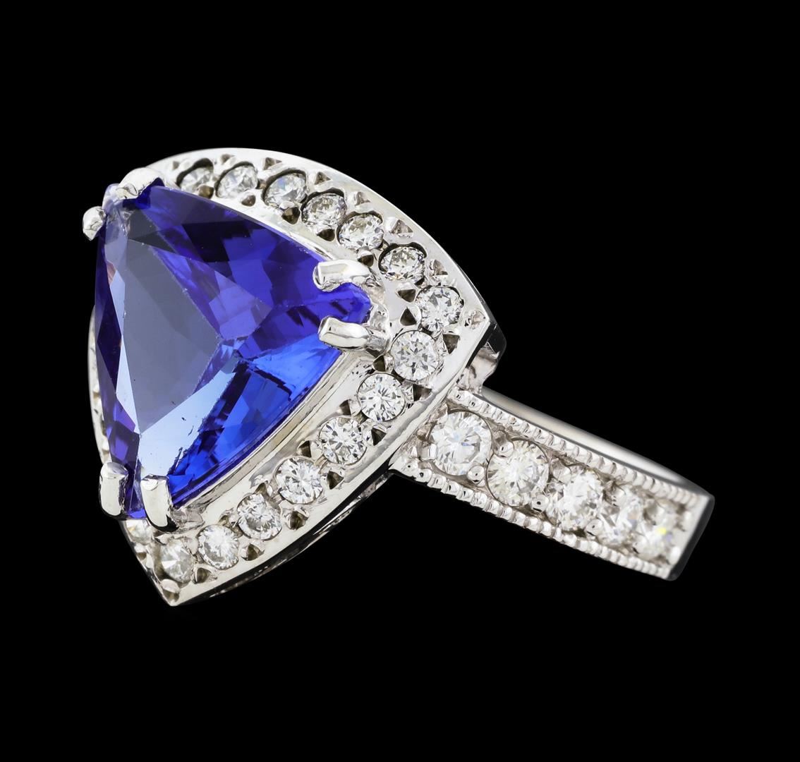 One electronically tested 14KT white gold lady's cast fashion ring with a cathedral halo with a bright polish with milgrain detailing finish. The featured lady's ring has a shank measuring 2.76 millimeters wide. Identified with markings of 'K14'. Condition is new, good workmanship. Containing: One prong set triangle modified brilliant cut natural tanzanite, measuring 11.76 x 11.48 x 4.97mm, (depth est.) approximate weight of 3.47ct., clarity is eye clean, medium dark, moderately strong, violetish blue color, (GIA vB 6/4), cut is very good. Transmitting light with no distortion, transparent. Colored gemstones are presumed to have been subjected to commonly used enhancement processes. Graded in the setting. Ten prong set round brilliant cut diamonds, measuring 2.30 - 2.20 x 1.40mm (depth est.) approximate total weight of 10 Stones = 0.43ct. Graded in the setting. Clarity SI-1 to SI-3. Color: H - I Cut Good Twenty-One bead set round brilliant cut diamonds, measuring 1.70 - 1.60 x 1.01mm (depth est.) approximate total weight of 21 Stones = 0.35ct. Graded in the setting. Clarity SI-1 to SI-3. Color: G - I Cut Good. Total Weight of Colored Stones 3.47ct.. Total Weight of Diamonds 0.78ct.. Total Weight of Ring 7.30gm. GAS Appraised at $9,075.00.
