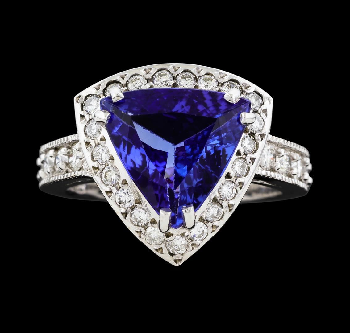 One electronically tested 14KT white gold lady's cast fashion ring with a cathedral halo with a bright polish with milgrain detailing finish. The featured lady's ring has a shank measuring 2.76 millimeters wide. Identified with markings of 'K14'. Condition is new, good workmanship. Containing: One prong set triangle modified brilliant cut natural tanzanite, measuring 11.76 x 11.48 x 4.97mm, (depth est.) approximate weight of 3.47ct., clarity is eye clean, medium dark, moderately strong, violetish blue color, (GIA vB 6/4), cut is very good. Transmitting light with no distortion, transparent. Colored gemstones are presumed to have been subjected to commonly used enhancement processes. Graded in the setting. Ten prong set round brilliant cut diamonds, measuring 2.30 - 2.20 x 1.40mm (depth est.) approximate total weight of 10 Stones = 0.43ct. Graded in the setting. Clarity SI-1 to SI-3. Color: H - I Cut Good Twenty-One bead set round brilliant cut diamonds, measuring 1.70 - 1.60 x 1.01mm (depth est.) approximate total weight of 21 Stones = 0.35ct. Graded in the setting. Clarity SI-1 to SI-3. Color: G - I Cut Good. Total Weight of Colored Stones 3.47ct.. Total Weight of Diamonds 0.78ct.. Total Weight of Ring 7.30gm. GAS Appraised at $9,075.00.