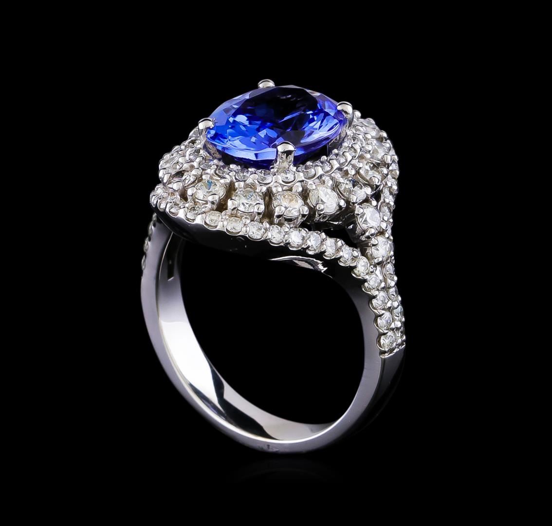 One electronically tested 14KT white gold lady's cast fashion ring with a split shank double basket halo with a bright polish finish. The featured lady's ring has a shank measuring 3.51 millimeters in width. Identified with markings of "K14". Condition is new, good workmanship. Containing: One prong set oval oval modified brilliant cut natural tanzanite, measuring 11.02 x 8.83 x 5.31mm, (depth est.) approximate weight of 3.47ct., clarity is eye clean, medium, moderately strong, violetish blue color, (GIA vB 5/4), cut is very good. Transmitting light with no distortion, transparent. Colored gemstones are presumed to have been subjected to commonly used enhancement processes. Graded in the setting. Two prong set round brilliant cut diamonds, measuring 2.00 - 1.95 x 1.23mm (depth est.) approximate total weight of 2 Stones = 0.06ct. Graded in the setting. Clarity: SI-2. Color: Good Eighteen prong set round brilliant cut diamonds, measuring 2.20 - 2.15 x 1.35mm (depth est.) approximate total weight of 18 Stones = 0.75ct. Graded in the setting. Clarity: SI-1 to SI-2. Color: H - I. Cut Good Seventy-Eight prong set round brilliant cut diamonds, measuring 1.40 - 1.30 x 0.84mm (depth est.) approximate total weight of 78 Stones = 0.76ct. Graded in the setting. Clarity: SI-1 to SI-2. Color: H - I. Cut Good. Total Weight of Colored Stones 3.47ct. Total Weight of Diamonds 1.57ct. Total Weight of Ring 8.40gm. GAS Appraised at $10,915.00.