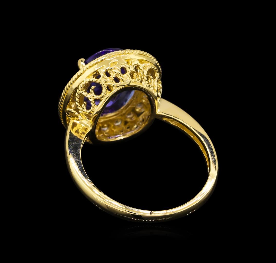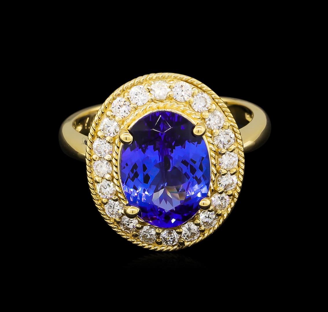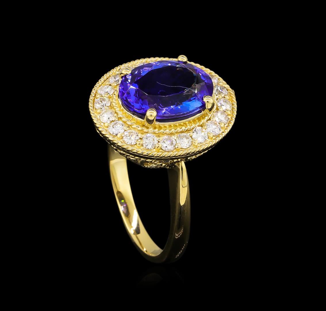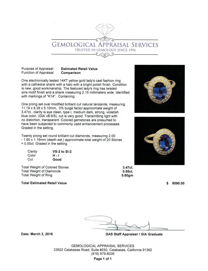One electronically tested 14KT yellow gold lady's cast fashion ring with a cathedral shank with a halo with a bright polish finish. The featured lady's ring has twisted wire motif finish and a shank measuring 2.15 millimeters wide. Identified with markings of "K14". Condition is new, good workmanship. Containing: One prong set oval modified brilliant cut natural tanzanite, measuring 11.19 x 8.38 x 5.10mm, 3%. bulge factor, approximate weight of 3.47ct., clarity is eye clean, type I, medium dark, strong, violetish blue color, (GIA vB 6/5), cut is very good. Transmitting light with no distortion, transparent. Colored gemstones are presumed to have been subjected to commonly used enhancement processes. Graded in the setting. Twenty prong set round brilliant cut diamonds, measuring 2.00 - 1.90 x 1.19mm (depth est.) approximate total weight of 20 Stones = 0.55ct. Graded in the setting. Clarity: VS-2 to SI-2. Color: H - I. Cut Good. Total Weight of Colored Stones 3.47ct. Total Weight of Diamonds 0.55ct. Total Weight of Ring 5.80gm. GAS Appraised at $8,090.00.