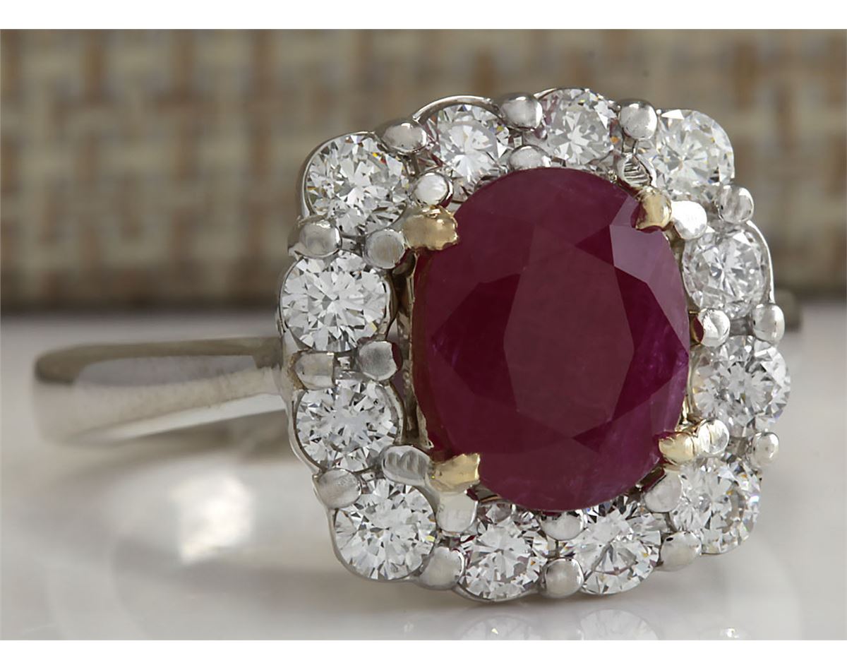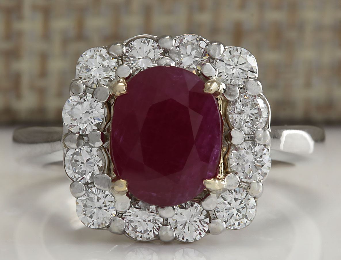 Stamped: 14K Ring Size: 6.25 Total Ring Weight: 6.5 Grams Diamond Weight: Total natural diamond weight is .90carat. SI1-SI2 clarity / G-H color Gemstone Weight: Total Natural Ruby Weight is 2.57ctw (Measures: 8.87x7.00mm) No glass or let treatment heated only Face Measures: 13.37x13.52mm Main stone color: Red [SKU:702843]