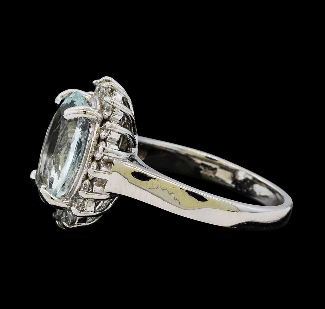 One Aquamarine and Diamond Ring including: 14KT White Gold weighing a total of 5.35 grams, Aquamarine weighing a total of 3.48ct, and 18 Diamonds weighing a total of 0.58ctw.