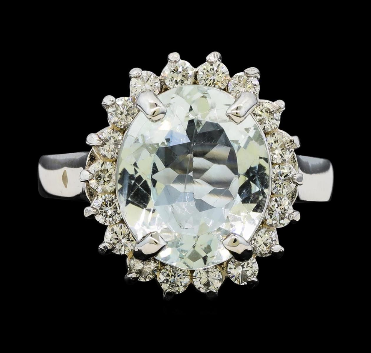 One Aquamarine and Diamond Ring including: 14KT White Gold weighing a total of 5.35 grams, Aquamarine weighing a total of 3.48ct, and 18 Diamonds weighing a total of 0.58ctw.