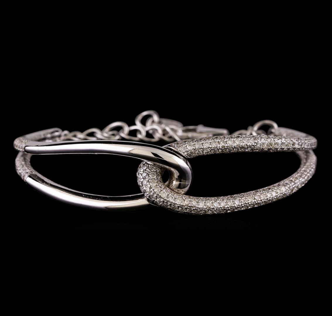 One electronically tested 14KT white gold lady's combination cast & assembled fashion cuff bracelet with a lobster claw clasp with a bright polish finish. The featured lady's cuff bracelet has an attached 4.4mm linked chain and can be worn between seven and eight inches in length, Identified with markings of 'K14'. Condition is new, good workmanship. Containing: Thirty prong set round brilliant cut diamonds, measuring 1.85 - 1.75 x 1.12mm (depth est.) approximate total weight of 30 Stones = 0.66ct. Graded in the setting. Clarity SI-1 to SI-2. Color: G - I Cut Good Two Hundred Forty-Nine prong set round brilliant cut diamonds, measuring 1.50 - 1.35 x 0.89mm (depth est.) approximate total weight of 249 Stones = 2.79ct. Graded in the setting. Clarity SI-1 to SI-2. Color: G - I Cut Good Six prong set round brilliant cut diamonds, measuring 1.10 - 1.05 x 0.67mm (depth est.) approximate total weight of 6 Stones = 0.03ct. Graded in the setting. Clarity SI-1 to SI-2. Color: G - I Cut Good. Total Weight of Diamonds 3.48ct.. Total Weight of Bracelet 19.40gm. GAS Appraised at $12,965.00.