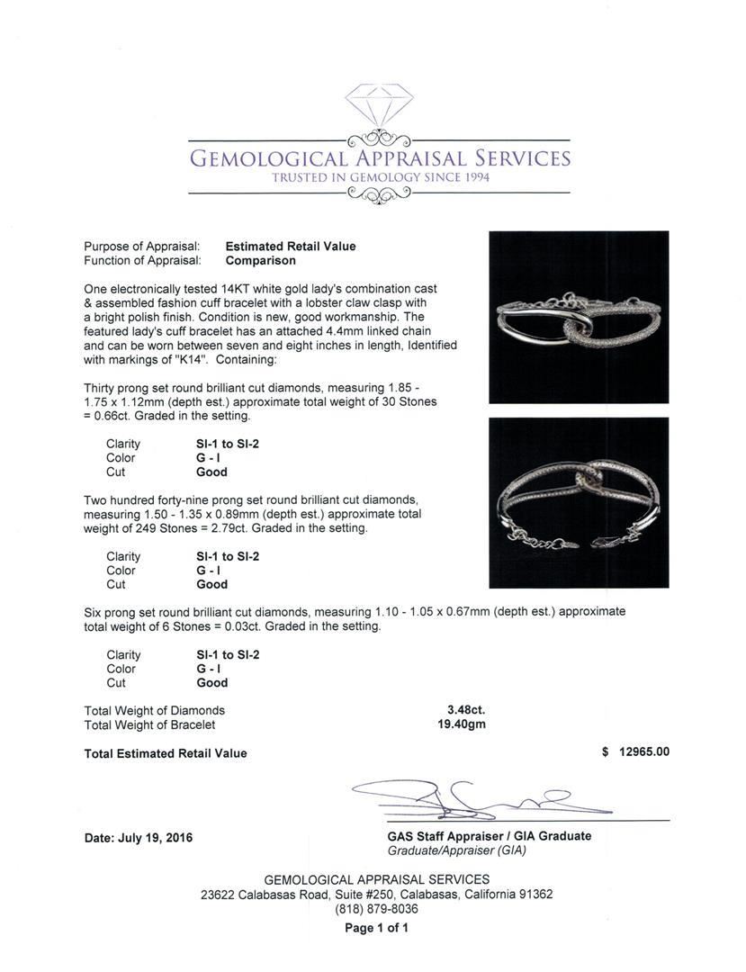 One electronically tested 14KT white gold lady's combination cast & assembled fashion cuff bracelet with a lobster claw clasp with a bright polish finish. The featured lady's cuff bracelet has an attached 4.4mm linked chain and can be worn between seven and eight inches in length, Identified with markings of 'K14'. Condition is new, good workmanship. Containing: Thirty prong set round brilliant cut diamonds, measuring 1.85 - 1.75 x 1.12mm (depth est.) approximate total weight of 30 Stones = 0.66ct. Graded in the setting. Clarity SI-1 to SI-2. Color: G - I Cut Good Two Hundred Forty-Nine prong set round brilliant cut diamonds, measuring 1.50 - 1.35 x 0.89mm (depth est.) approximate total weight of 249 Stones = 2.79ct. Graded in the setting. Clarity SI-1 to SI-2. Color: G - I Cut Good Six prong set round brilliant cut diamonds, measuring 1.10 - 1.05 x 0.67mm (depth est.) approximate total weight of 6 Stones = 0.03ct. Graded in the setting. Clarity SI-1 to SI-2. Color: G - I Cut Good. Total Weight of Diamonds 3.48ct.. Total Weight of Bracelet 19.40gm. GAS Appraised.