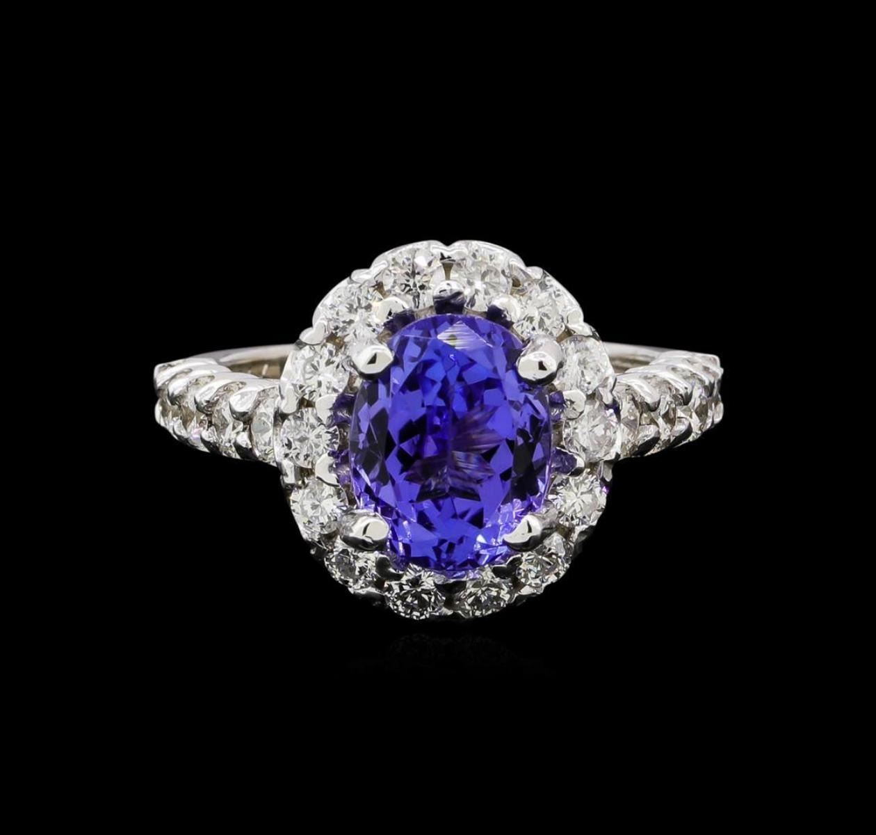 One electronically tested 14KT white gold lady's cast fashion ring with a basket halo with a bright polish finish. The featured lady's ring has a shank measuring 2.32 millimeters in width. Identified with markings of '14K'. Condition is new, good workmanship. Containing: One prong set oval modified brilliant cut natural tanzanite, measuring 9.68 x 7.60 x 5.75mm, (depth est.) 15%. bulge factor, approximate weight of 3.48ct., clarity is eye clean, medium, moderately strong, bluish violet color, (GIA bV 5/4), cut is good. Transmitting light with no distortion, transparent. Colored gemstones are presumed to have been subjected to commonly used enhancement processes. Graded in the setting. Twenty-Four prong set round brilliant cut diamonds, measuring 2.35 - 2.30 x 1.44mm (depth est.) approximate total weight of 24 Stones = 1.15ct. Graded in the setting. Clarity SI-1 to I-1. Color: H - I Cut Good. Total Weight of Colored Stones 3.48ct.. Total Weight of Diamonds 1.15ct.. Total Weight of Ring 6.40gm.