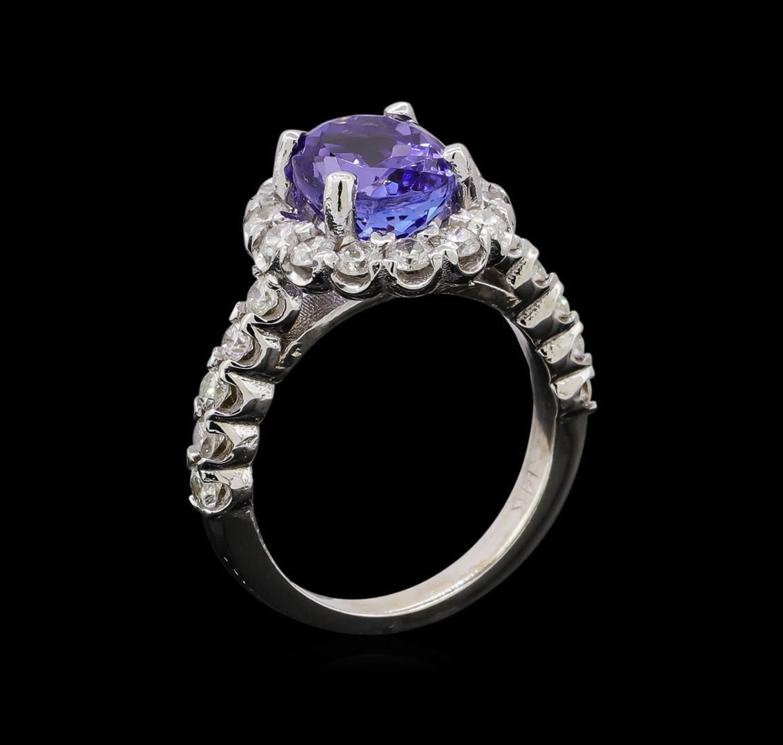 One electronically tested 14KT white gold lady's cast fashion ring with a basket halo with a bright polish finish. The featured lady's ring has a shank measuring 2.32 millimeters in width. Identified with markings of '14K'. Condition is new, good workmanship. Containing: One prong set oval modified brilliant cut natural tanzanite, measuring 9.68 x 7.60 x 5.75mm, (depth est.) 15%. bulge factor, approximate weight of 3.48ct., clarity is eye clean, medium, moderately strong, bluish violet color, (GIA bV 5/4), cut is good. Transmitting light with no distortion, transparent. Colored gemstones are presumed to have been subjected to commonly used enhancement processes. Graded in the setting. Twenty-Four prong set round brilliant cut diamonds, measuring 2.35 - 2.30 x 1.44mm (depth est.) approximate total weight of 24 Stones = 1.15ct. Graded in the setting. Clarity SI-1 to I-1. Color: H - I Cut Good. Total Weight of Colored Stones 3.48ct.. Total Weight of Diamonds 1.15ct.. Total Weight of Ring 6.40gm.