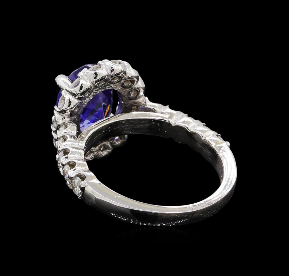 One electronically tested 14KT white gold lady's cast fashion ring with a basket halo with a bright polish finish. The featured lady's ring has a shank measuring 2.32 millimeters in width. Identified with markings of '14K'. Condition is new, good workmanship. Containing: One prong set oval modified brilliant cut natural tanzanite, measuring 9.68 x 7.60 x 5.75mm, (depth est.) 15%. bulge factor, approximate weight of 3.48ct., clarity is eye clean, medium, moderately strong, bluish violet color, (GIA bV 5/4), cut is good. Transmitting light with no distortion, transparent. Colored gemstones are presumed to have been subjected to commonly used enhancement processes. Graded in the setting. Twenty-Four prong set round brilliant cut diamonds, measuring 2.35 - 2.30 x 1.44mm (depth est.) approximate total weight of 24 Stones = 1.15ct. Graded in the setting. Clarity SI-1 to I-1. Color: H - I Cut Good. Total Weight of Colored Stones 3.48ct.. Total Weight of Diamonds 1.15ct.. Total Weight of Ring 6.40gm.